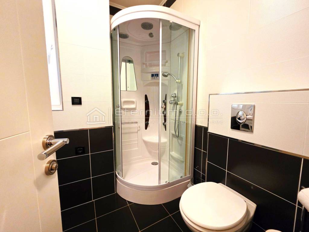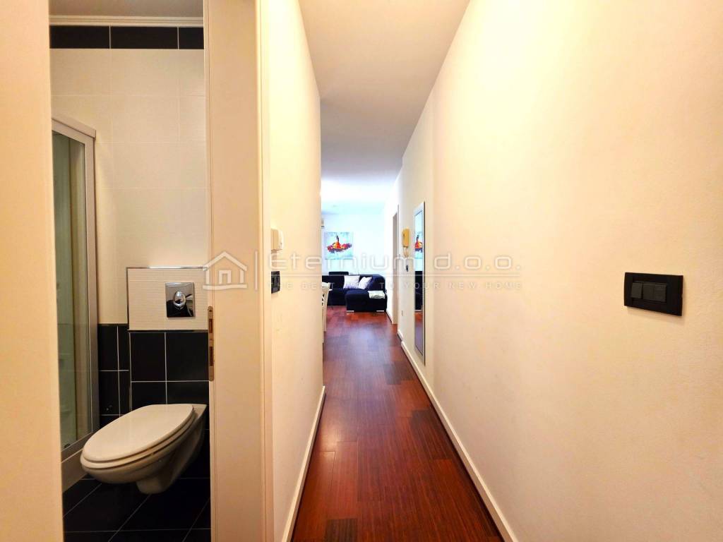 The apartment’s equipment is also first-class — it features a security door, underfloor heating, top-quality ceramics and parquet flooring, air-conditioned rooms, PVC joinery, and more. It is sold fully furnished with high-quality furniture that adds a touch of luxury to the entire space.