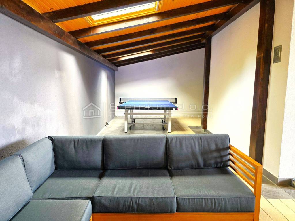 The highlight of this property is the outdoor space — a 55 m² terrace, fully covered and accessible from the living area. It has been designed and equipped brilliantly: there’s a dining table with four chairs for outdoor meals and relaxation, a lounge zone perfect for morning or evening coffee, and even a play area with a table tennis setup for extra fun! Given its generous size, there is also the possibility to arrange an additional bedroom here with minimal investment. From the terrace, there is even a partial sea view.