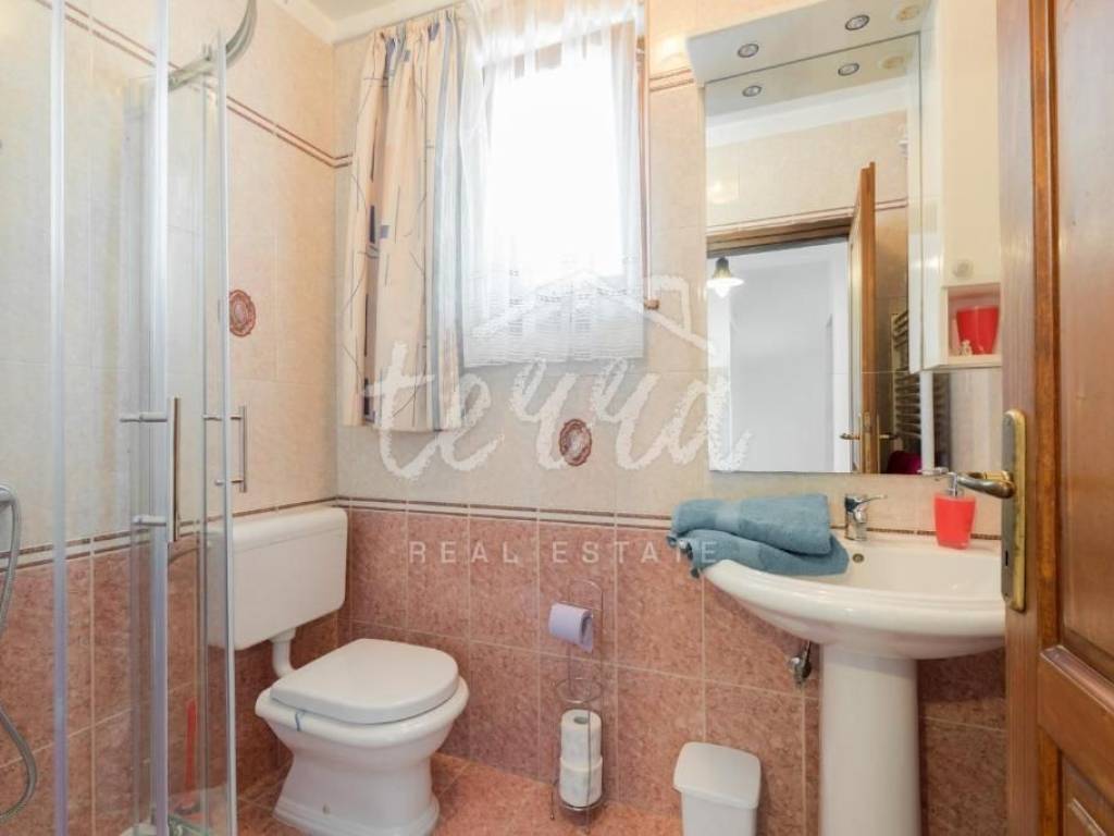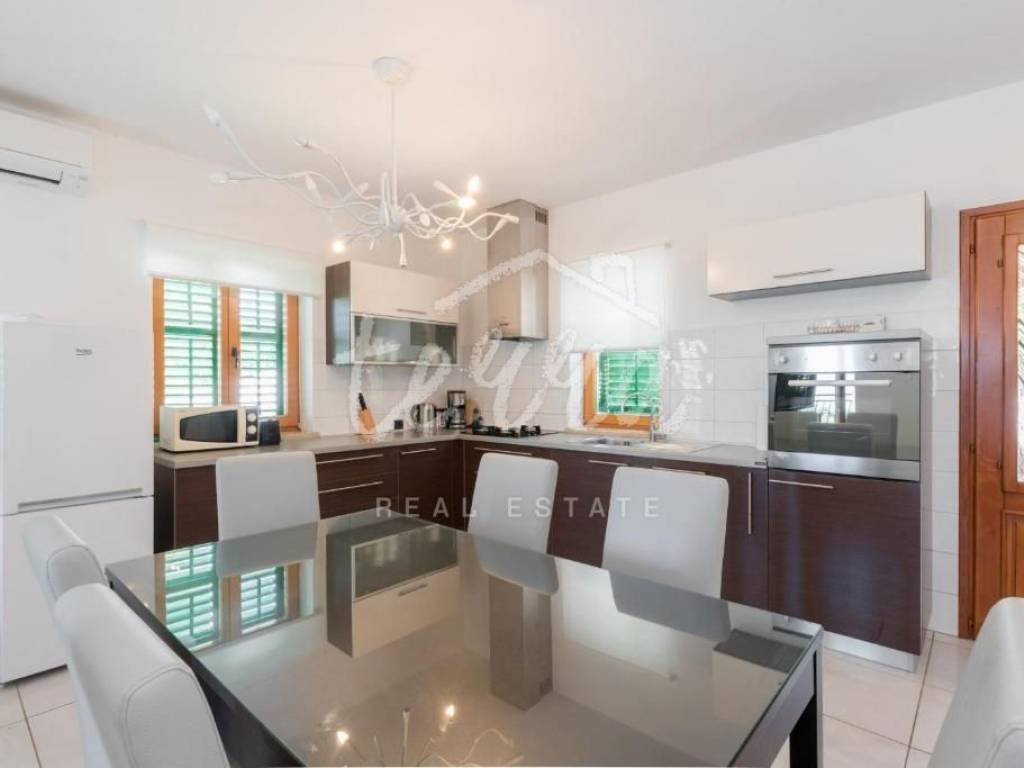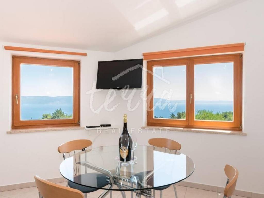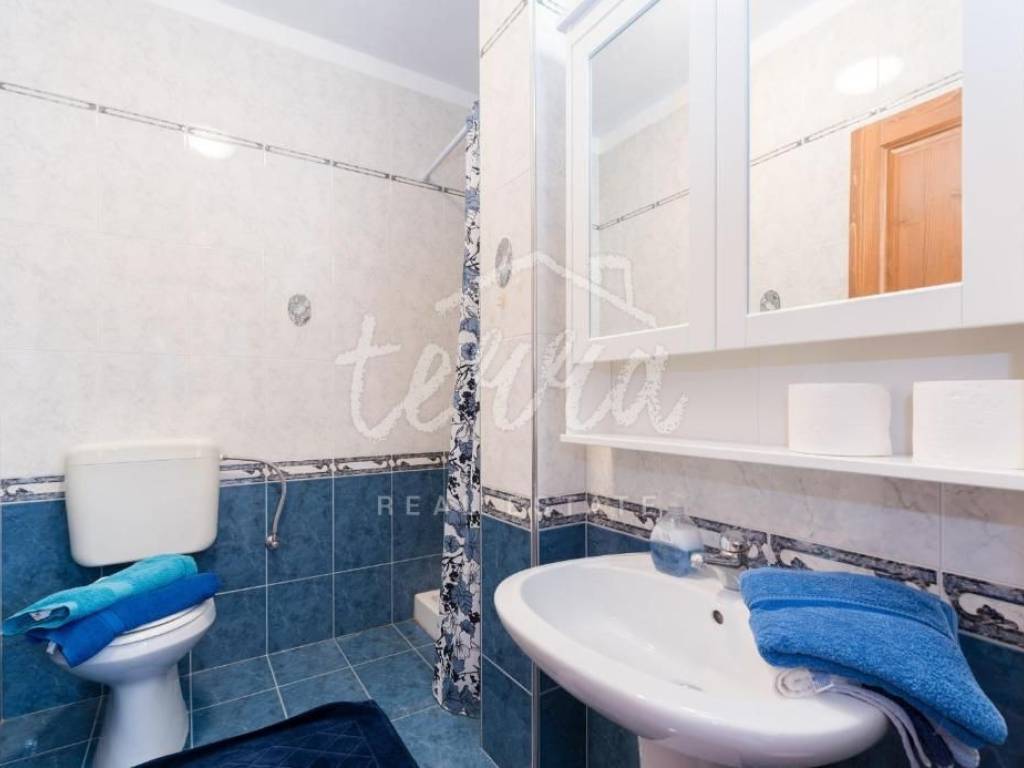 On the ground floor there is an apartment consisting of a hallway, a kitchen with a dining room, a living room, two bedrooms, a bathroom, a storage room, and a covered terrace with a beautiful view of the sea.