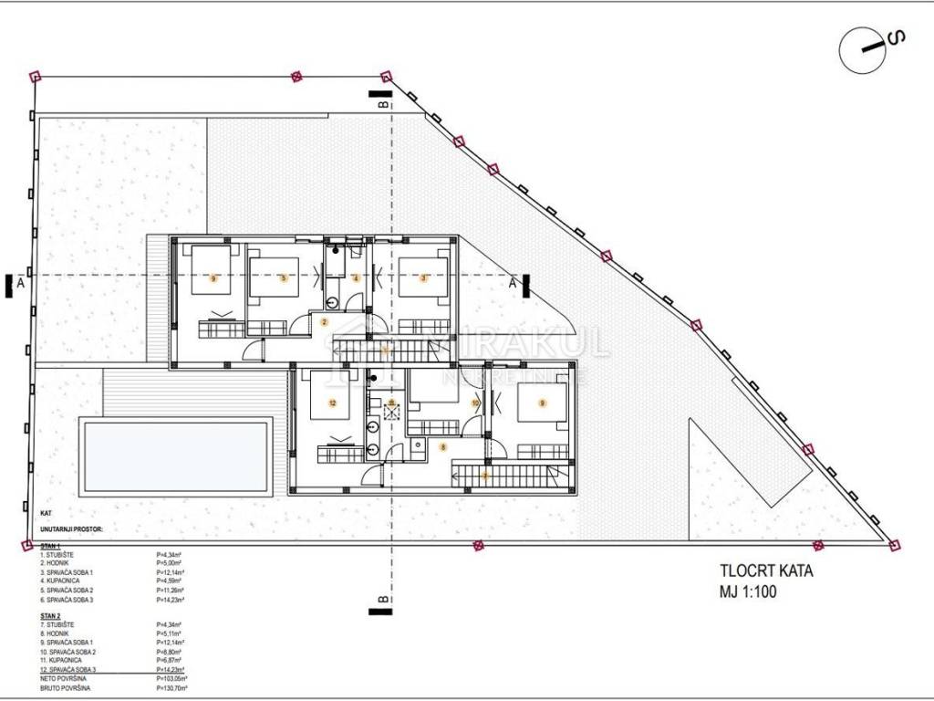 FLAT S2 consists of a ground floor, a first floor, a terrace and a garden with a swimming pool.