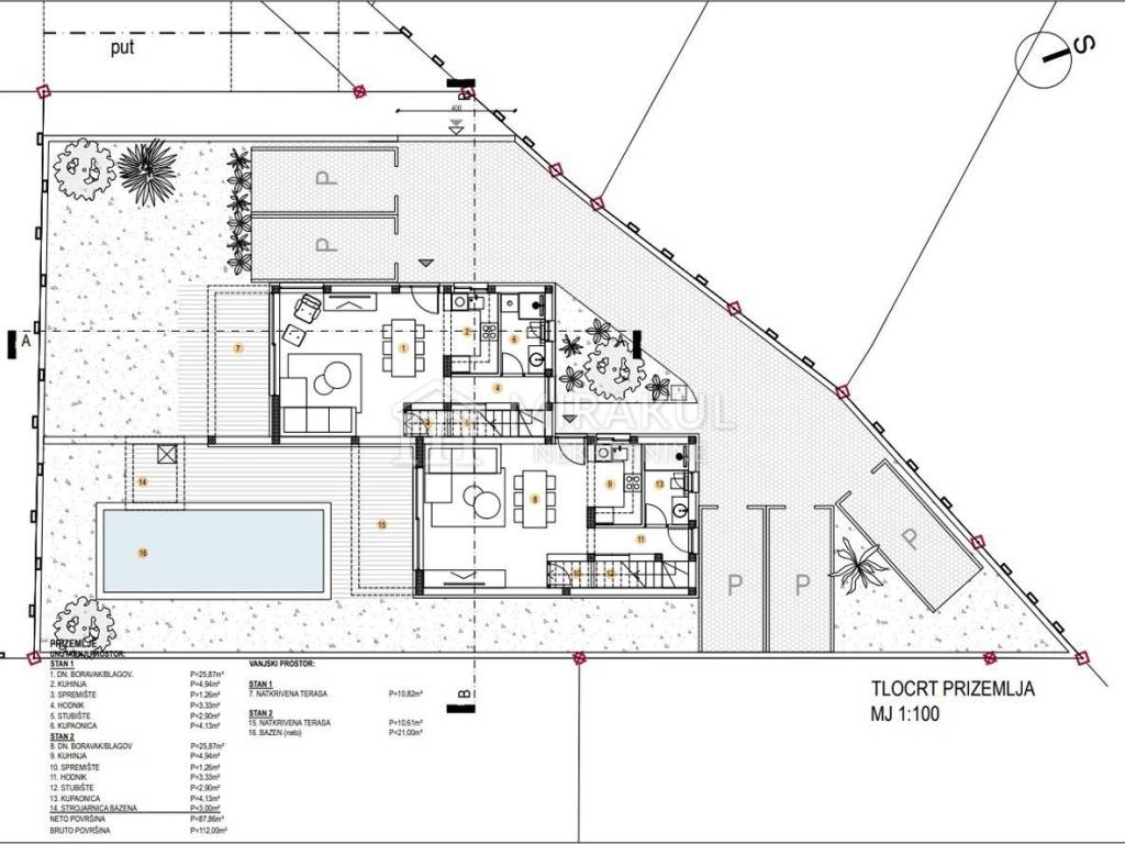 On the ground floor there is a living room/dining room (25.87 m2), a kitchen (4.94 m2), a storage room (1.26 m2), a corridor (3.33 m2), a staircase (2.90 m2), a bathroom (4, 13 m2), a covered terrace (10.61 m2) and a swimming pool (7x3m) with a garden.