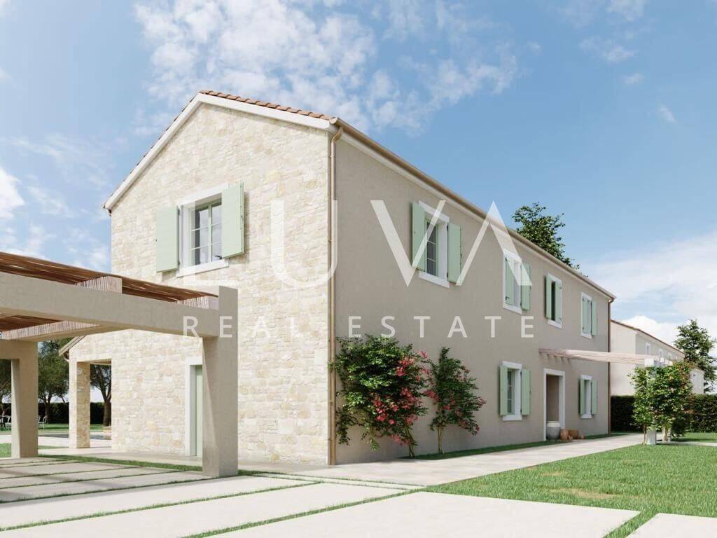 A luxury villa with a pool is under construction and is expected to be completed by May 2026. The villa is located in Buje, on the western coast of Istria. It will be built on a large elevated plot of 4,000 m², offering stunning panoramic views of the sea and surroundings. The exterior of the villa will feature a traditional style with stone walls, a sloping roof with tiles, and charming wooden shutters, while the interior will be designed in a more modern style. The villa will have a total area of 350 m², spread across 2 floors. The ground floor will include a living room, kitchen, and a wellness area with a sauna and Jacuzzi. All these rooms will open onto a beautifully landscaped garden with a large outdoor pool. Additionally, there will be a small apartment with a separate entrance intended for staff on the ground floor. The first floor will feature 4 bedrooms, each with its own bathroom, while the master bedroom will have access to a spacious terrace. The villa will be equipped with the latest technology, such as a heat pump for heating/cooling, and will be furnished with designer furniture.