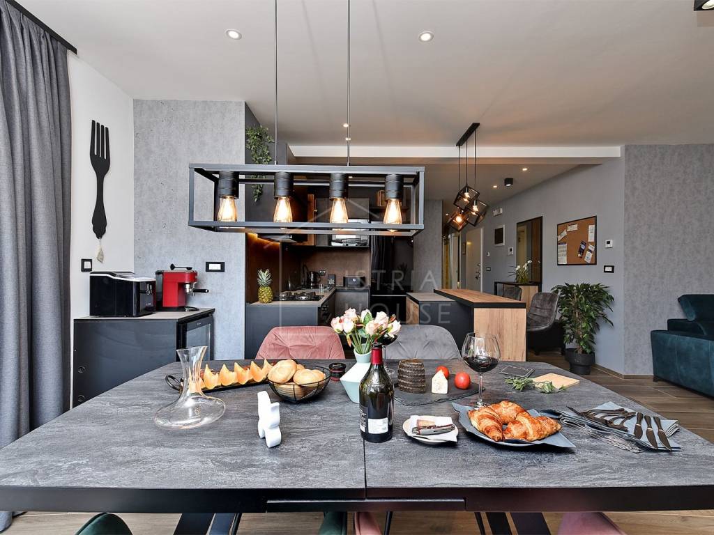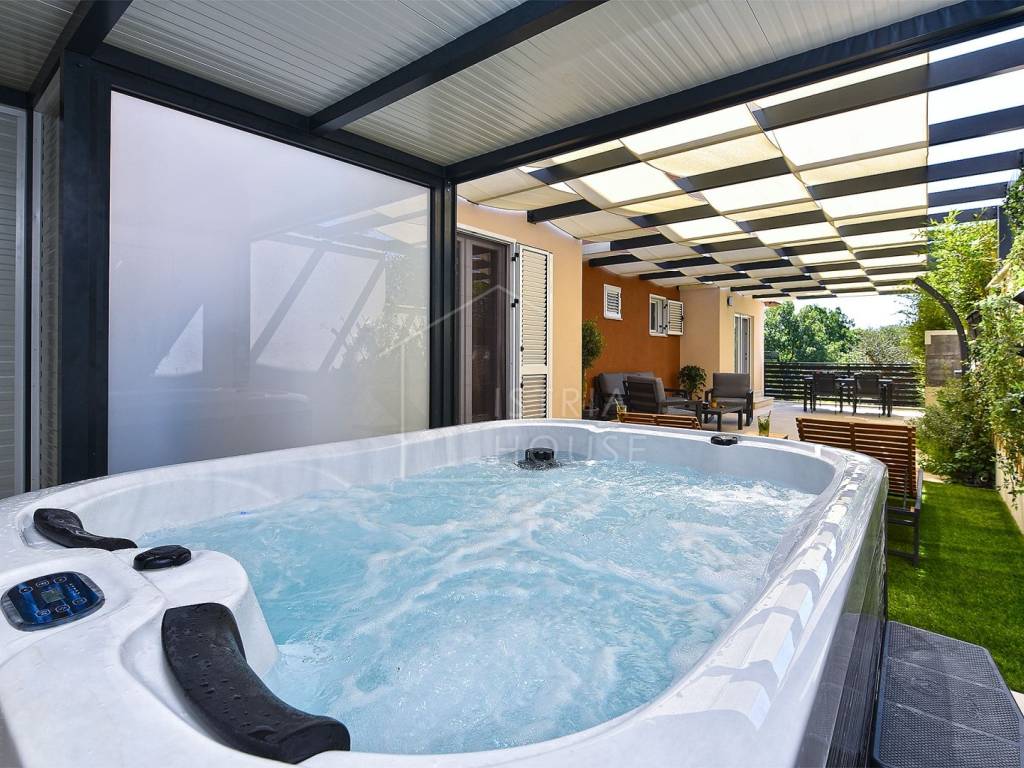 L'esterno dell'appartamento è dominato da una terrazza arredata (tavolo da pranzo, grill) e da un'area benessere (vasca idromassaggio).