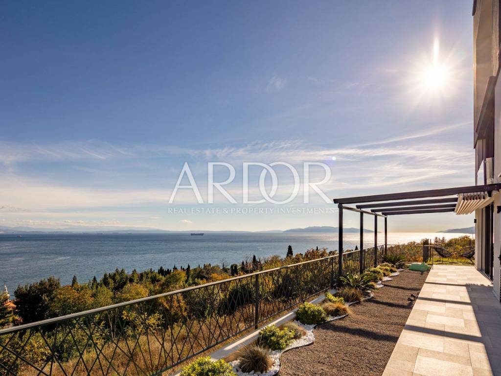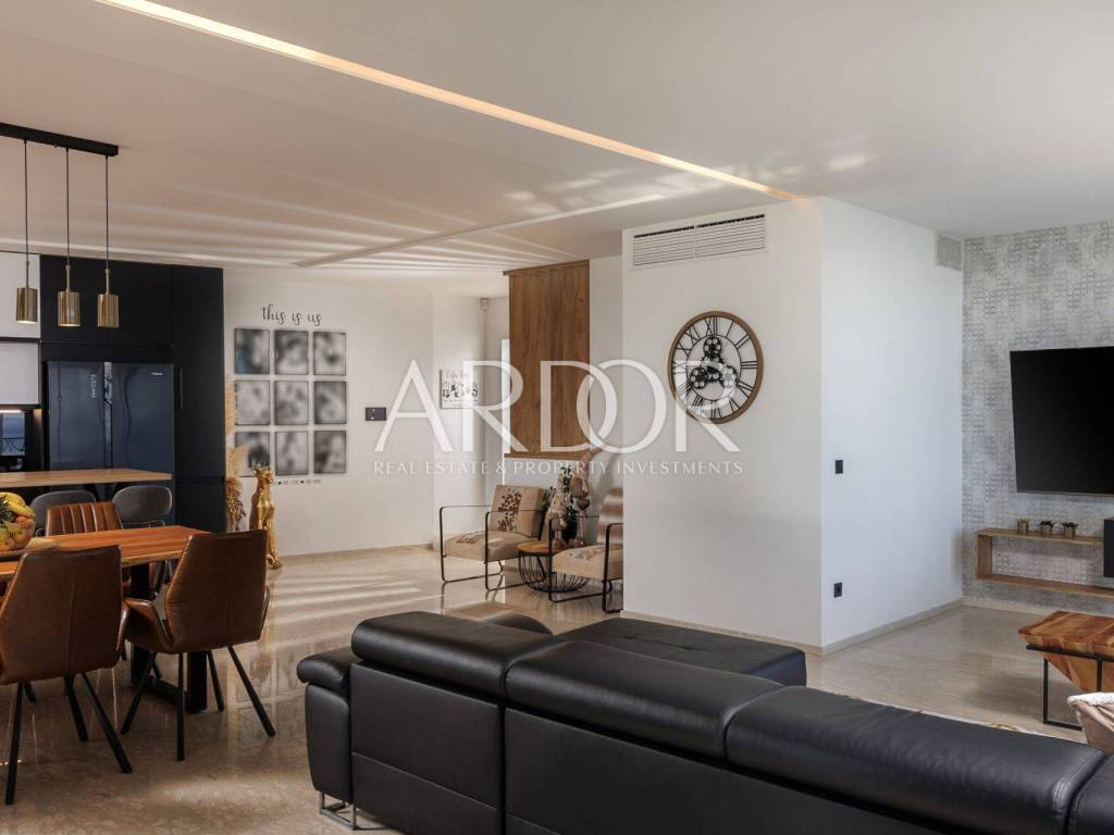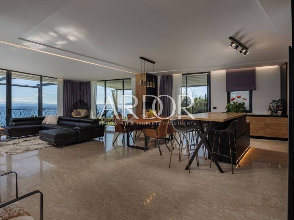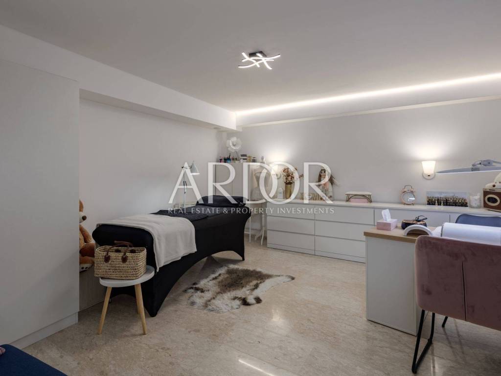 L’appartamento è composto da quattro camere da letto, tre bagni (uno dei quali en-suite nella camera padronale), lavanderia, studio con wine-bar, locale tecnico e un ampio soggiorno open space con zona pranzo e cucina. La sala da pranzo e il soggiorno hanno accesso diretto a una terrazza coperta con tavolo da pranzo all’aperto e cucina estiva con barbecue. L’area esterna della terrazza è coperta da tre pergole automatizzate per una superficie totale di 80 m².