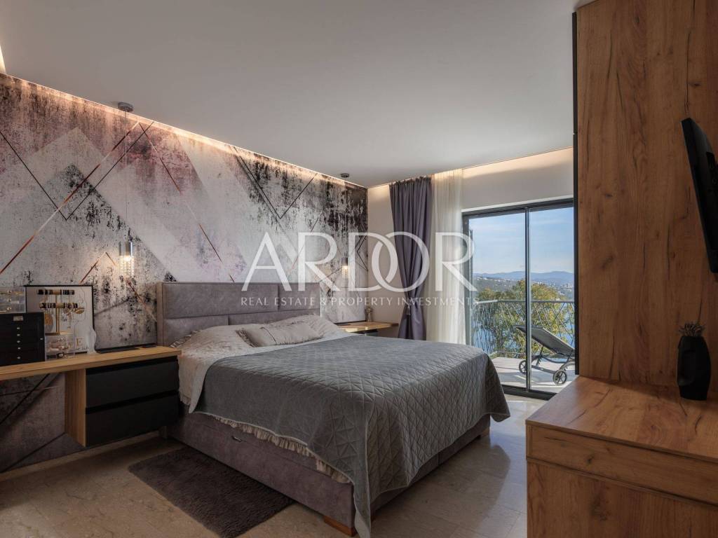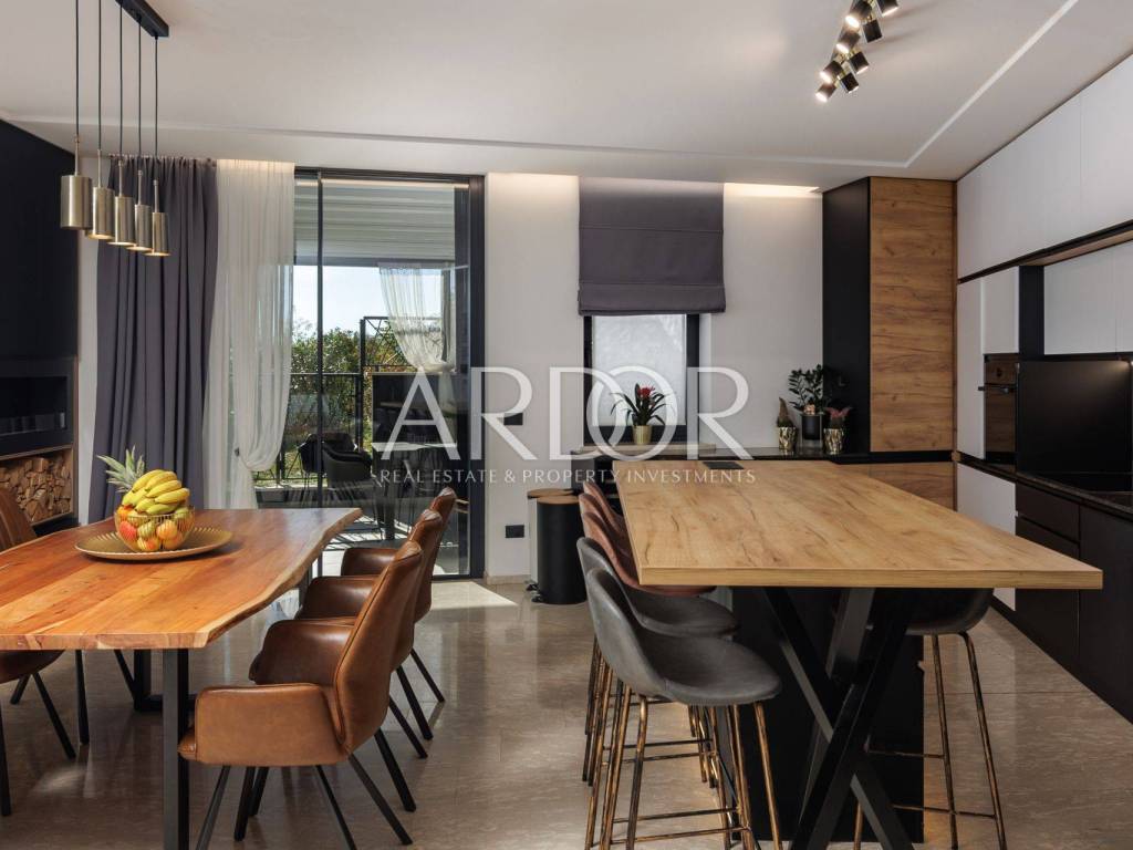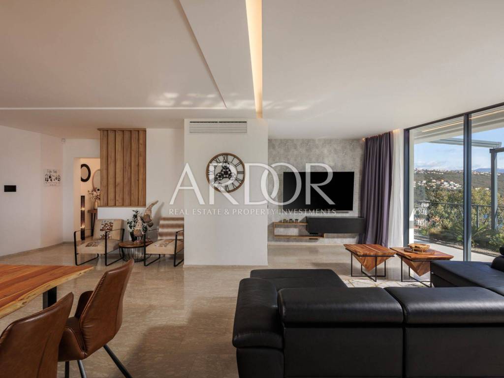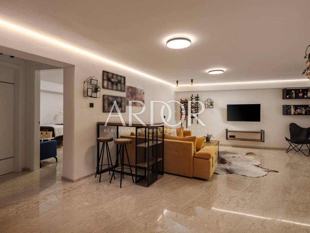 L’appartamento è composto da quattro camere da letto, tre bagni (uno dei quali en-suite nella camera padronale), lavanderia, studio con wine-bar, locale tecnico e un ampio soggiorno open space con zona pranzo e cucina. La sala da pranzo e il soggiorno hanno accesso diretto a una terrazza coperta con tavolo da pranzo all’aperto e cucina estiva con barbecue. L’area esterna della terrazza è coperta da tre pergole automatizzate per una superficie totale di 80 m².