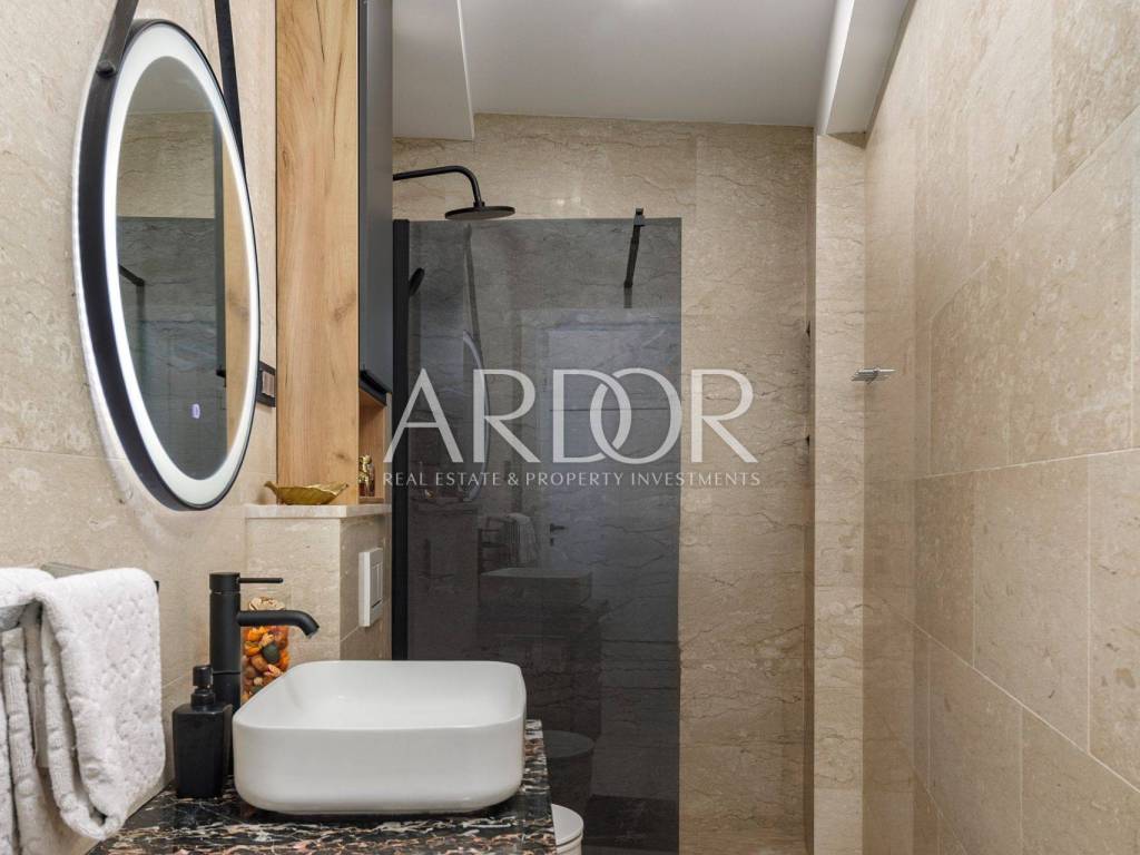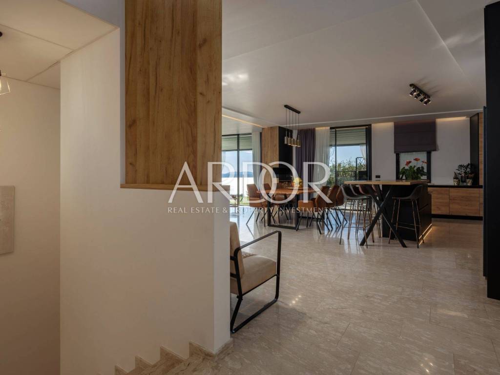 Nei 230 m² di superficie abitativa sono state utilizzate pietre italiane Royal di prima scelta come rivestimento per pavimenti e pareti, mentre il piano cucina e i bagni sono rifiniti in marmo Nero Portoro. Nei restanti 64 m² del seminterrato è stata installata ceramica italiana di alta qualità, anch’essa con riscaldamento a pavimento a pompa di calore.
