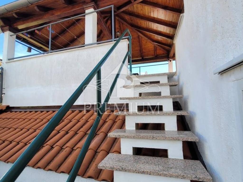 Dal piano terra rialzato al piano con la zona notte si possono percorrere anche le scale interne. Ci sono 3 camere da letto, una cucina e un soggiorno e un ampio bagno. Ai balconi si accede dal soggiorno e dalla camera matrimoniale, dalla quale si gode di una bellissima vista mare. Dato che la casa non è direttamente sulla strada, abbiamo la privacy garantita.