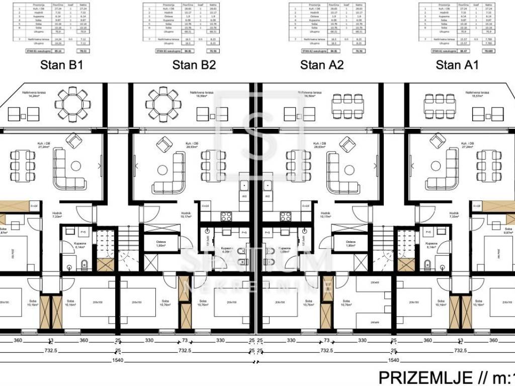L'appartamento si trova al piano terra di un nuovo edificio di alta qualità con un totale di otto appartamenti (A1). È composto da tre camere da letto, un bagno, un corridoio, un soggiorno con cucina e sala da pranzo e una terrazza coperta di 15,57 m². L'appartamento dispone inoltre di due posti auto.