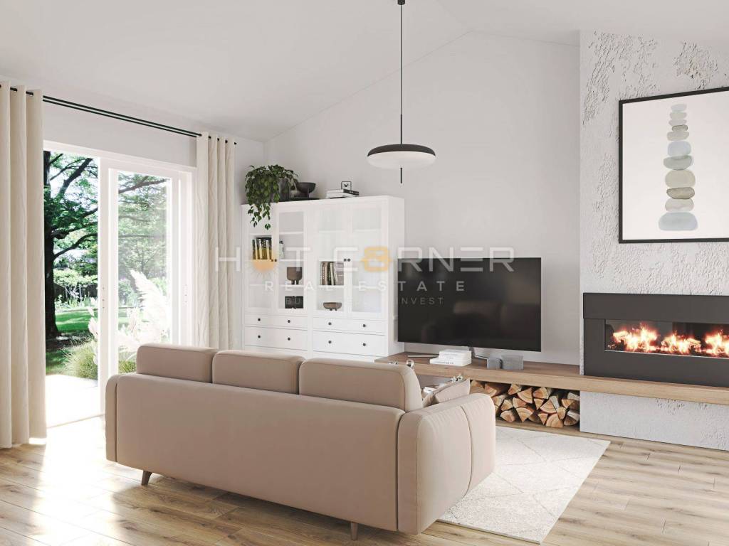 La casa è situata su un terreno di 425 m2, il cortile è concepito come area verde, e ci sono due posti auto esterni nella parte anteriore.