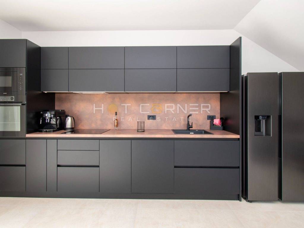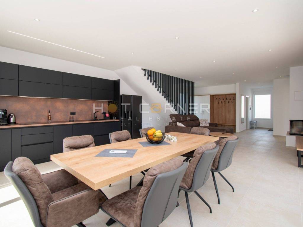 Non appena entrerete nella villa, rimarrete incantati dall'ampio soggiorno, sala da pranzo e cucina, che hanno accesso diretto alla terrazza e al solarium con piscina.