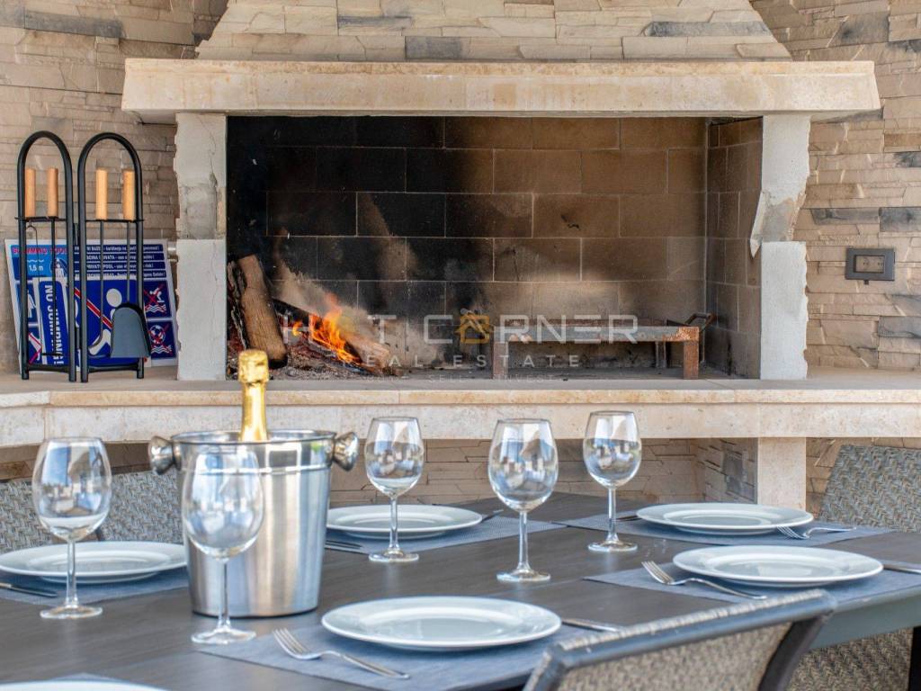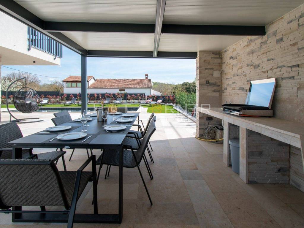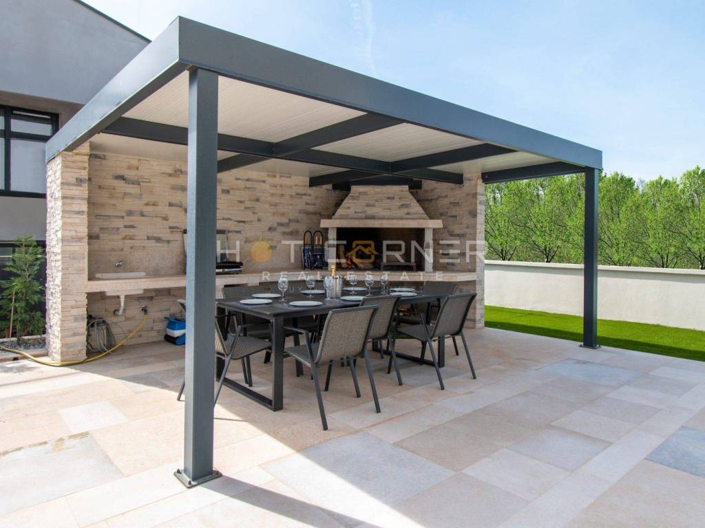 Sulla terrazza vicino alla piscina e al solarium si trovano un tavolo da pranzo e una cucina estiva con camino a legna e gas, che sarà in parte chiusa e rivestita con pannelli massicci. Accanto alla cucina estiva c'è anche un parco giochi per bambini. I dintorni della villa saranno piantumati e decorati con piante mediterranee.