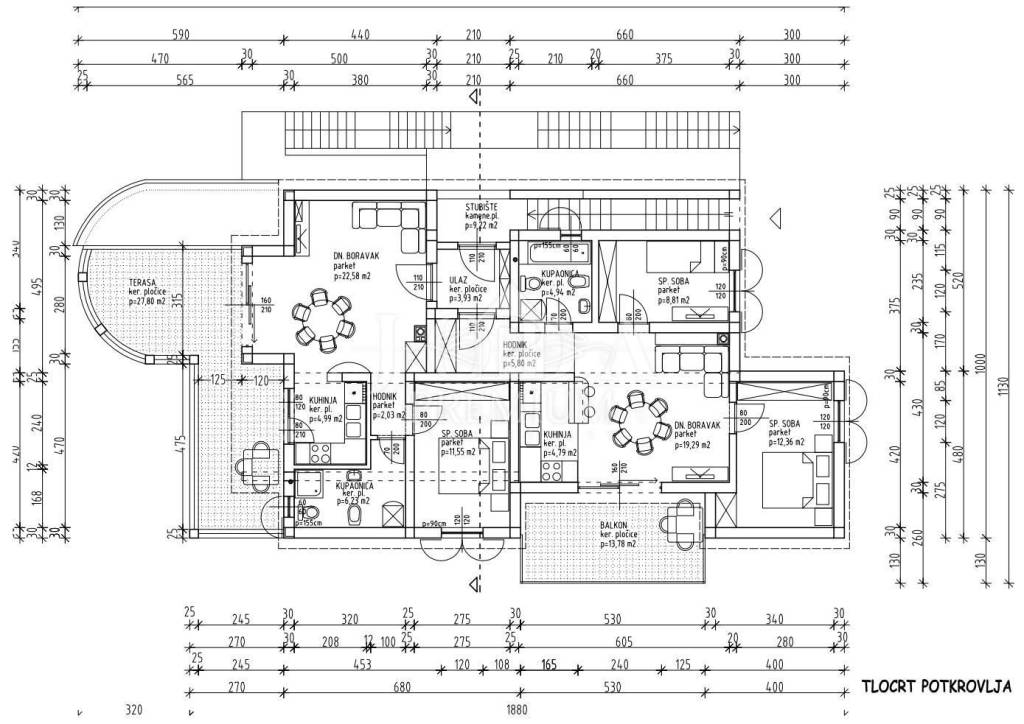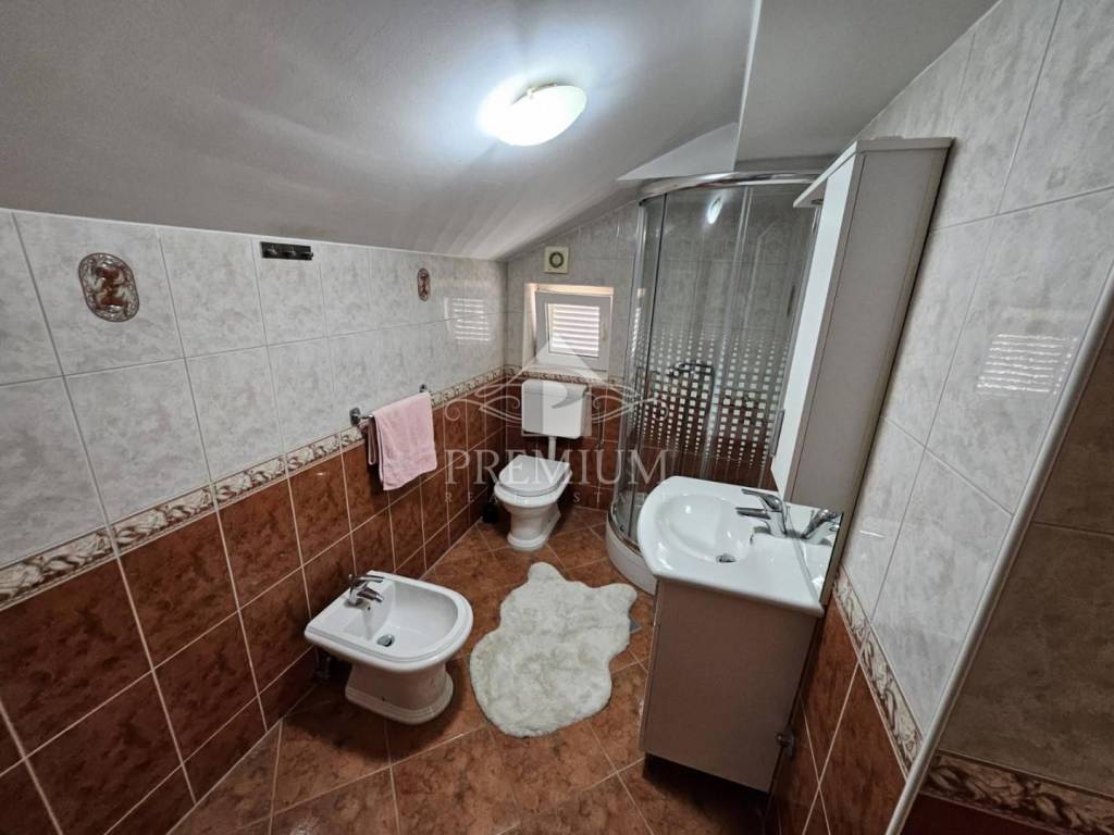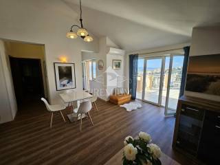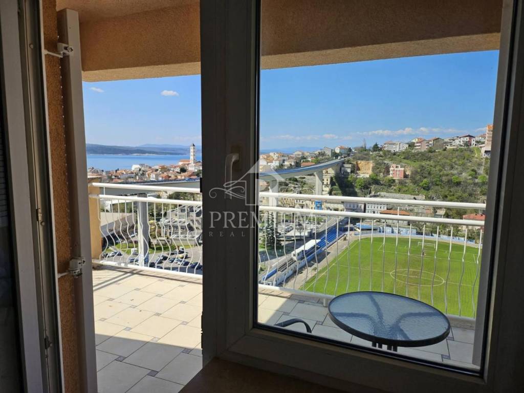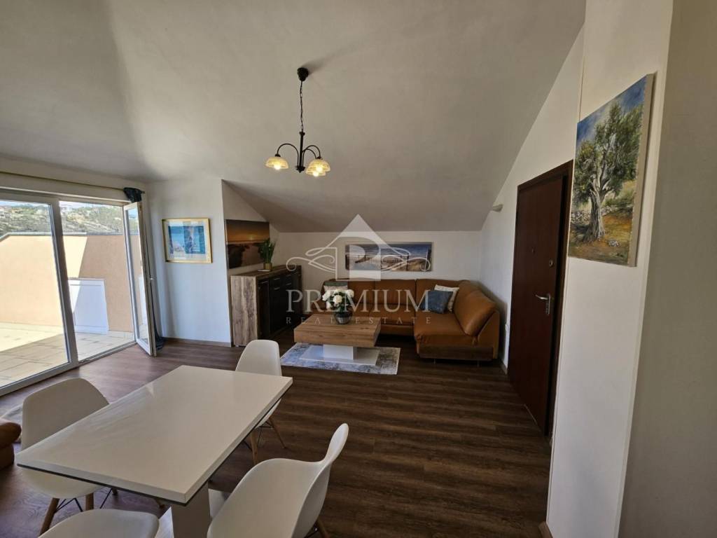 L'appartamento è composto da corridoio, cucina, soggiorno e sala da pranzo, camera da letto, bagno e un ampio terrazzo di 27,80 m2 con vista panoramica sul mare e su tutta Crikvenica. La superficie utile netta totale dell'appartamento è di 79,15 m2. L'appartamento dispone inoltre di un ripostiglio e di un posto auto situato all'interno del giardino.