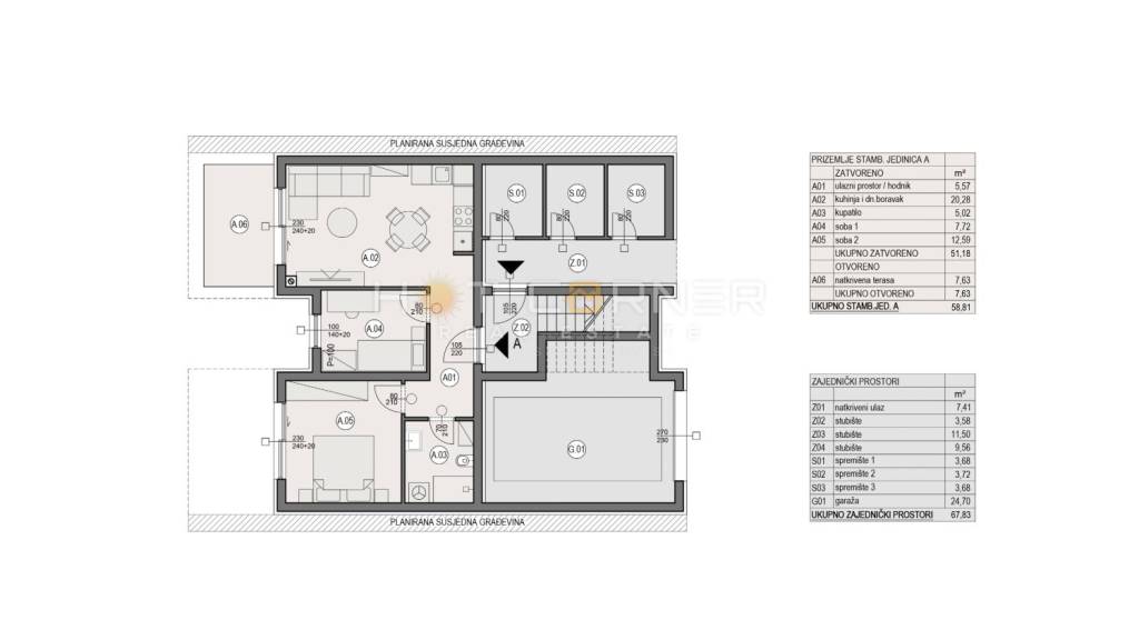 Appartamento "A" piano terra 93,66 mq + parcheggio P1+P4 5 mq + ripostiglio S02 3,72 mq + giardino = 295.720,00 euro