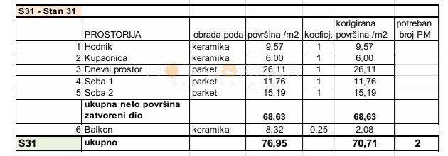 L’appartamento ha una superficie di 70,74 m² ed è composto da un ingresso, un bagno, due camere da letto confortevoli e un ampio soggiorno open space con zona pranzo e cucina, con accesso a una spaziosa terrazza esposta a sud (8,32 m²) con una vista rilassante sulla pineta e i dintorni.