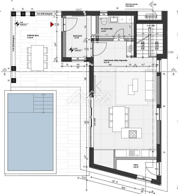 The central part of the fenced yard is a large swimming pool with a sun deck, next to which an outdoor covered dining room is planned, and within the yard a paved area is also planned, which is intended as a covered parking lot for at least two vehicles.