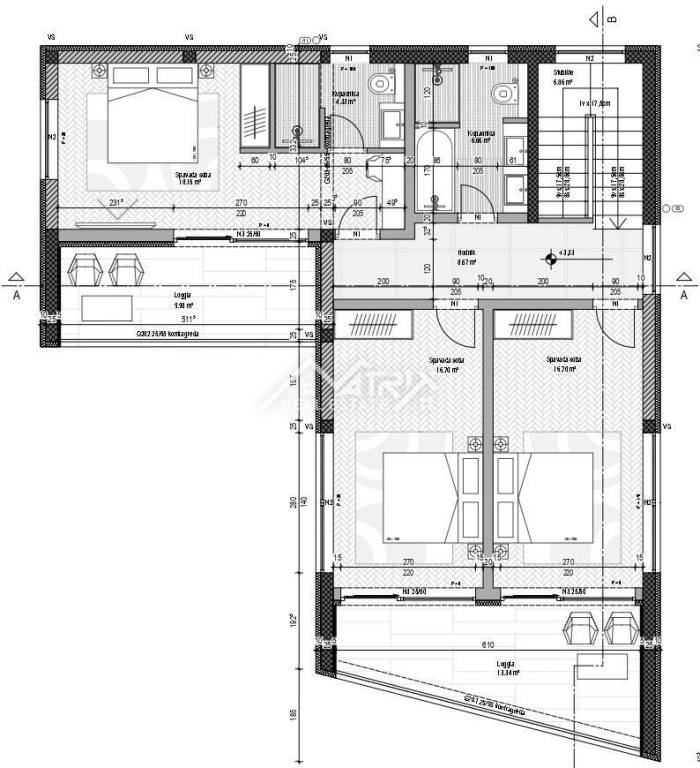 The villa extends over the ground floor and first floor, with a total living area of 190 m2. The ground floor of the house is designed as an open space that unites the living room with the dining room and kitchen, and the ground floor is complete with a guest toilet, laundry room and technical room. The living room leads to the pool terrace through large glass walls that provide plenty of light throughout the day, as well as a beautiful view of the sea. The internal stairs lead to the first floor where there are three bedrooms, of which the master bedroom has its own bathroom and its own loggia, while the remaining two bedrooms have a shared bathroom and a shared loggia.