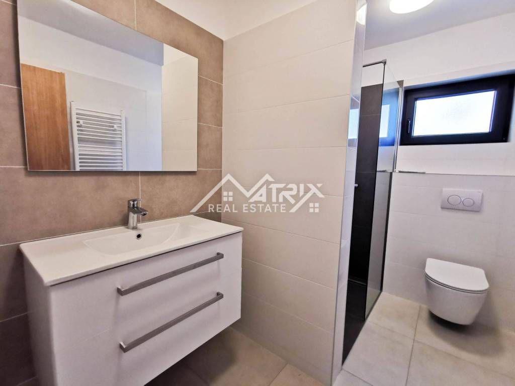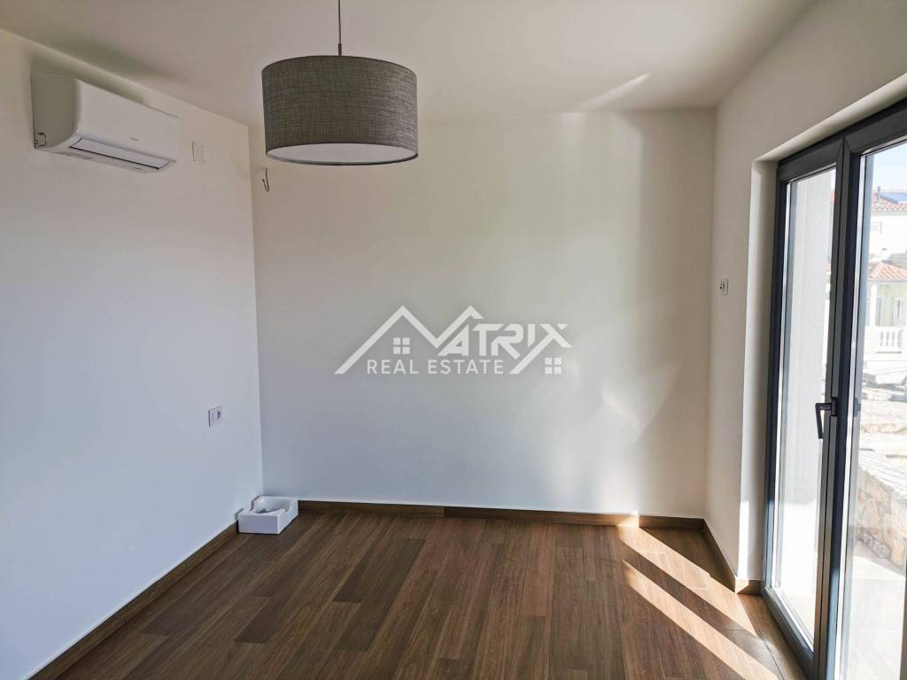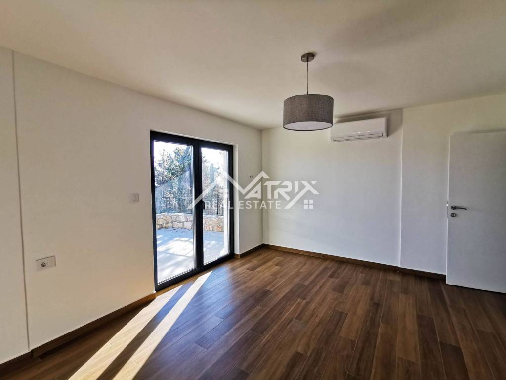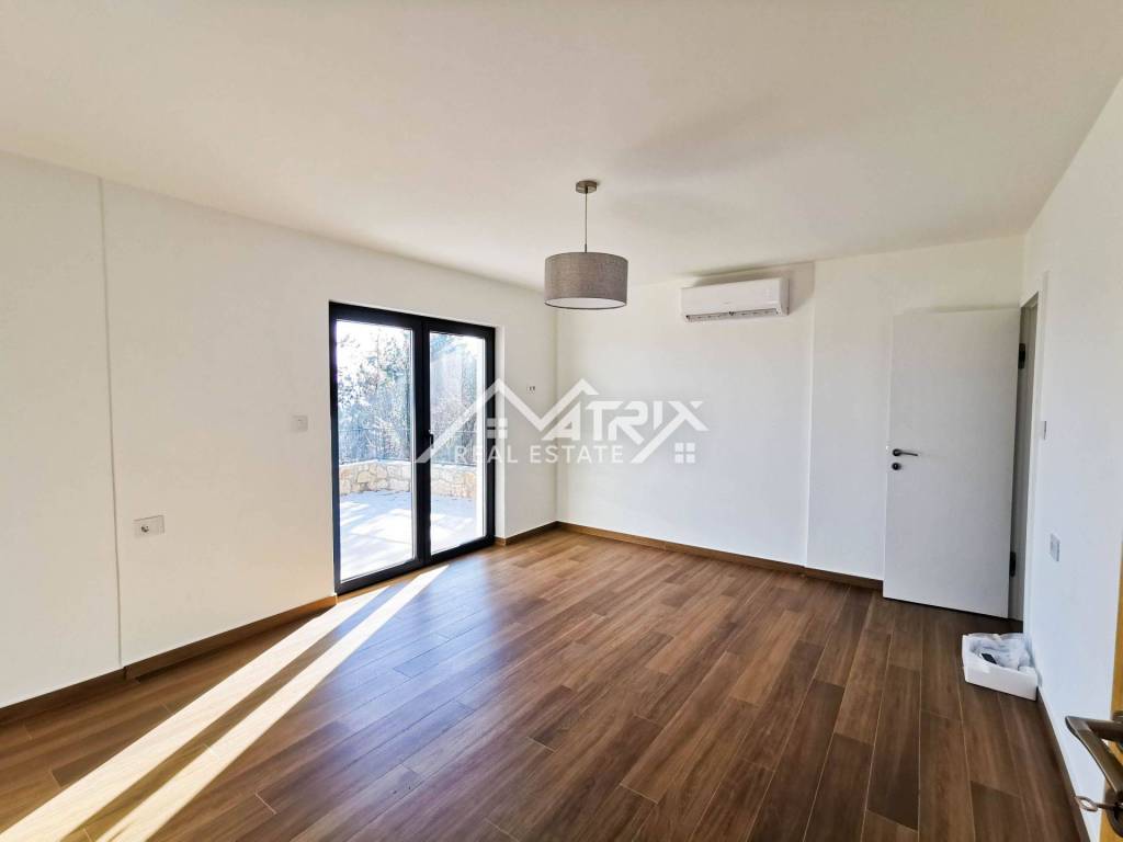 The yard is landscaped and has private parking for 1 vehicle. On the first floor of the house there is a spacious open space that unites a modern kitchen with a dining room and a bright living room with access to an outdoor terrace with an incredible view of the sea and the island of Cres. Also, there is a guest toilet on this floor, which provides additional convenience. On the ground floor of the house there are two comfortable bedrooms with a bathroom and access to the terrace with a beautiful view of the sea. Air conditioners ensure a comfortable temperature throughout the year, which makes this house an ideal place to live or rent.