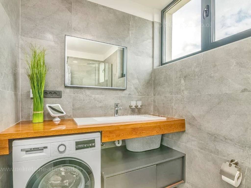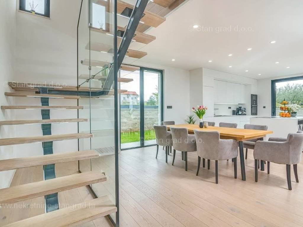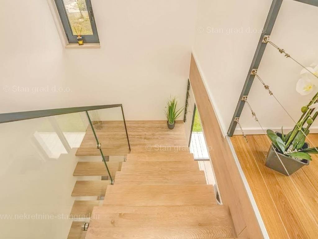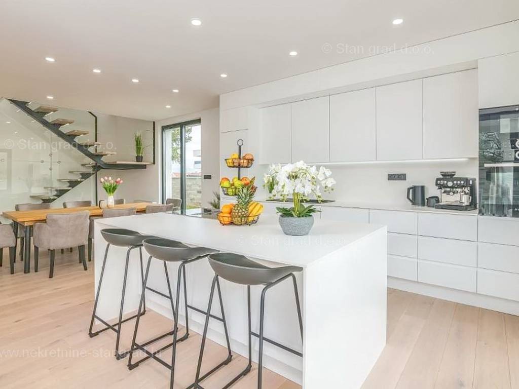 Strutturalmente, si tratta di una casa indipendente su due piani. L'immobile, di eccezionale attrattiva, è composto da due piani in totale. La superficie totale dell'immobile è di 195 m². Al piano terra si trovano l'ingresso, la centrale termica, un WC, una cucina con sala da pranzo e un soggiorno, dal quale si accede a una spaziosa terrazza. Una scala interna conduce al piano superiore, dove sono situati 3 bagni e 3 camere da letto, due delle quali hanno accesso a terrazze coperte. L'interno dell'immobile, ben mantenuto e arredato con lusso, è dotato di un ricco set di dispositivi di ultima generazione.