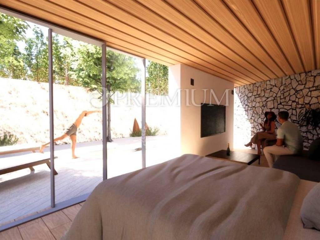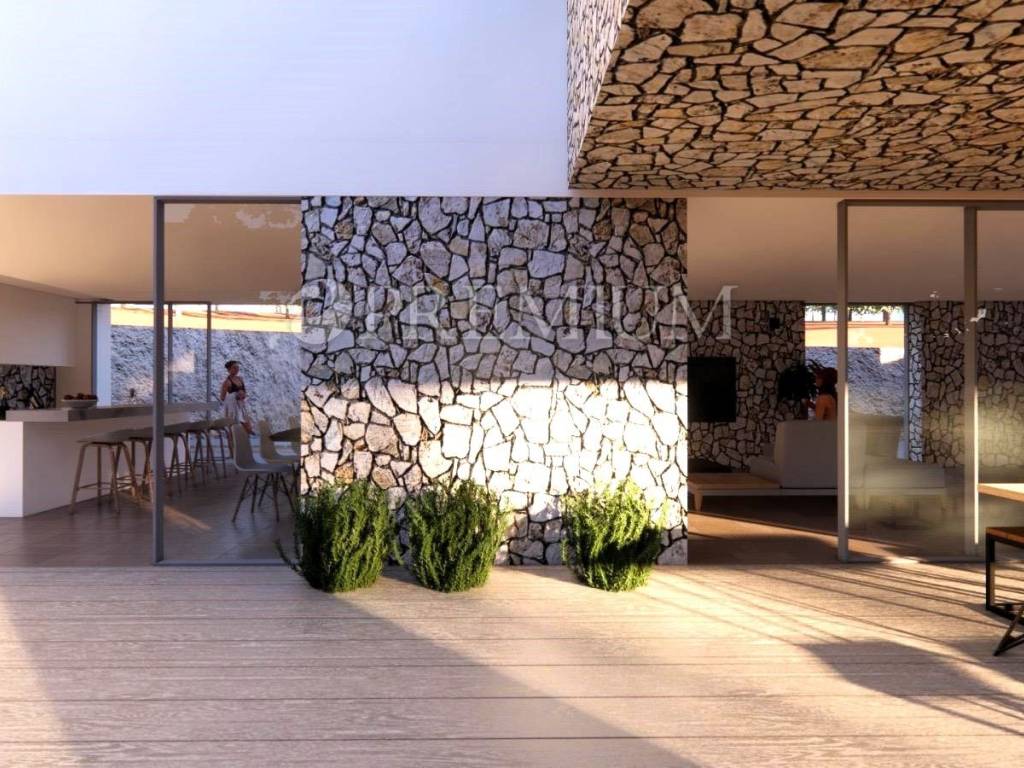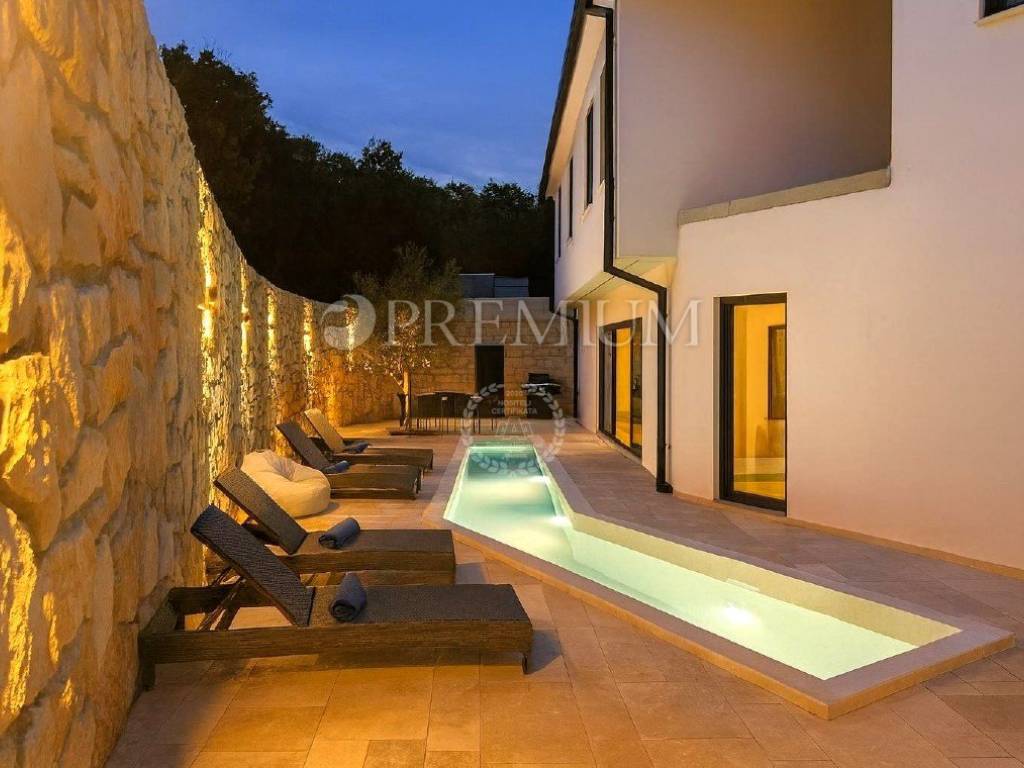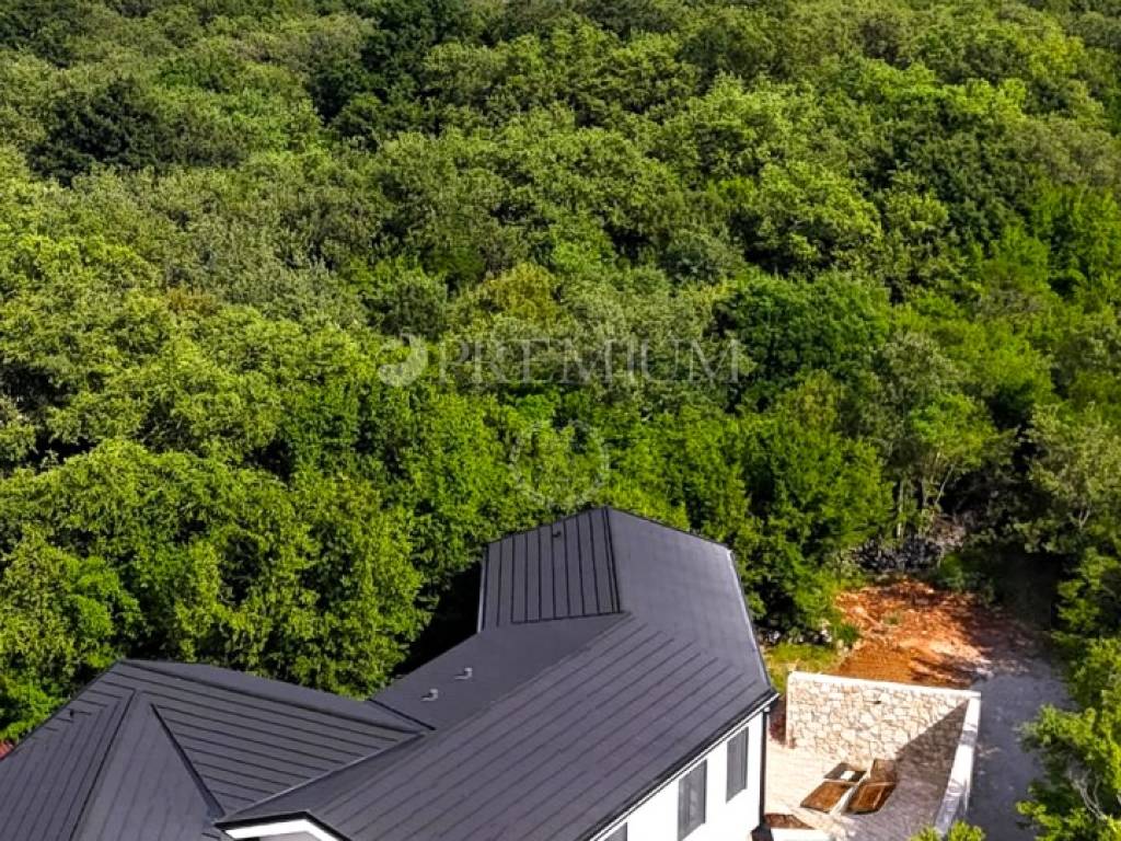Vrbnik, periferia – in vendita villa indipendente progettata con modernità, di qualità costruttiva superiore, situata in totale privacy e tranquillità, immersa in una foresta di querce. L’edificio è di nuova costruzione (2025) e si sviluppa su due livelli – seminterrato e piano terra – per una superficie abitabile complessiva di 410 m².
