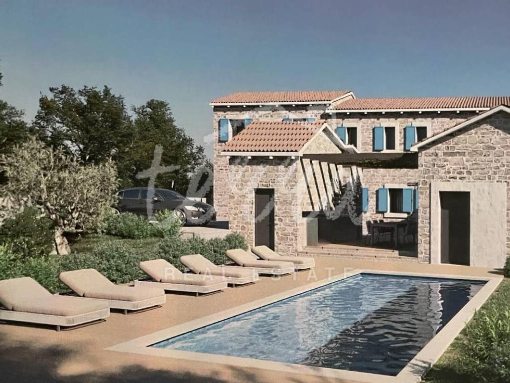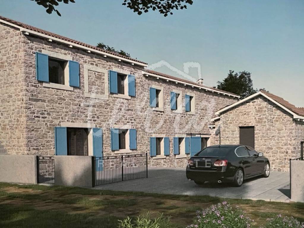 Autochthonous Istrian stone house for adaptation, with a view of the green expanses of Učka. The building has a floor plan area of 187m2 with an attached garden of 490m2. The house as an independent building has its own uniqueness and has a building permit. The building is in need of reconstruction and is an excellent investment for tourism (the owners have prepared a preliminary and main project for this purpose). Conceived as a perfect combination of traditional and modern with a fenced yard in Mediterranean style, with a swimming pool, sun deck and summer kitchen.
