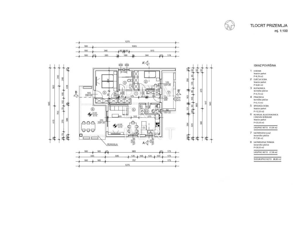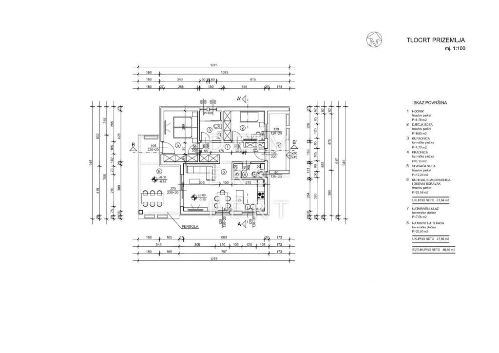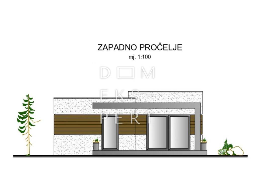Prema glavnom projektu, na zemljištu je predviđena gradnja slobodnostojeće prizemnice s ravnim krovom, tlocrtnih dimenzija 12.75 m x 9.45 m, ukupne neto površine 88.60 m².