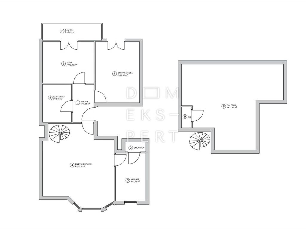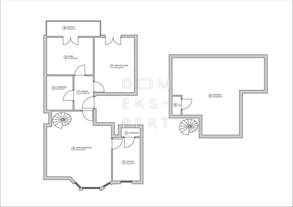LAYOUT: - Hallway: 3.91 m² - Bathroom: 5.75 m² - Two bedrooms: 13.45 m² and 10.93 m² - Kitchen with pantry: 8.81 m² - Living room: 27.18 m² - Balcony: 5.43 m² - Gallery with WC: 33.55 m²