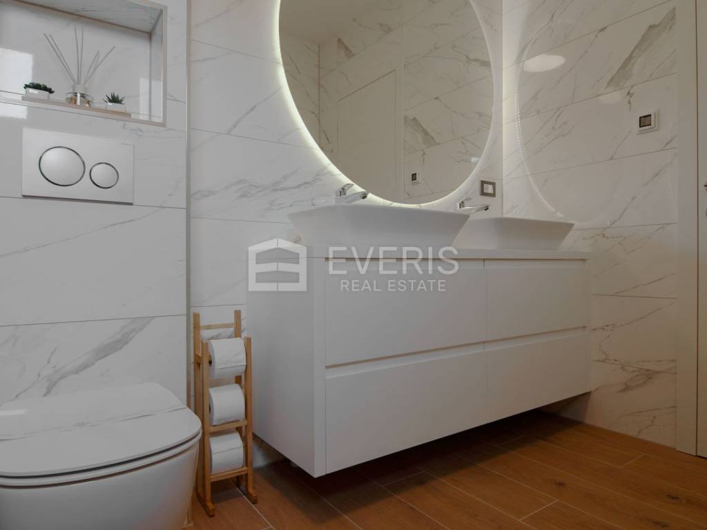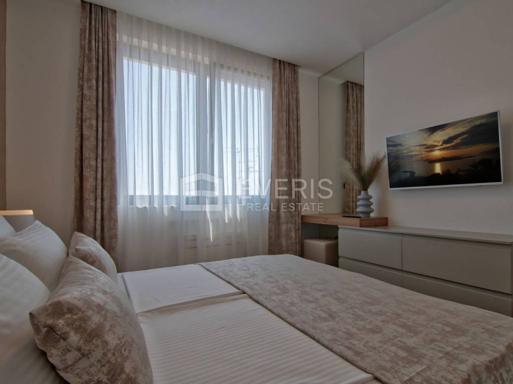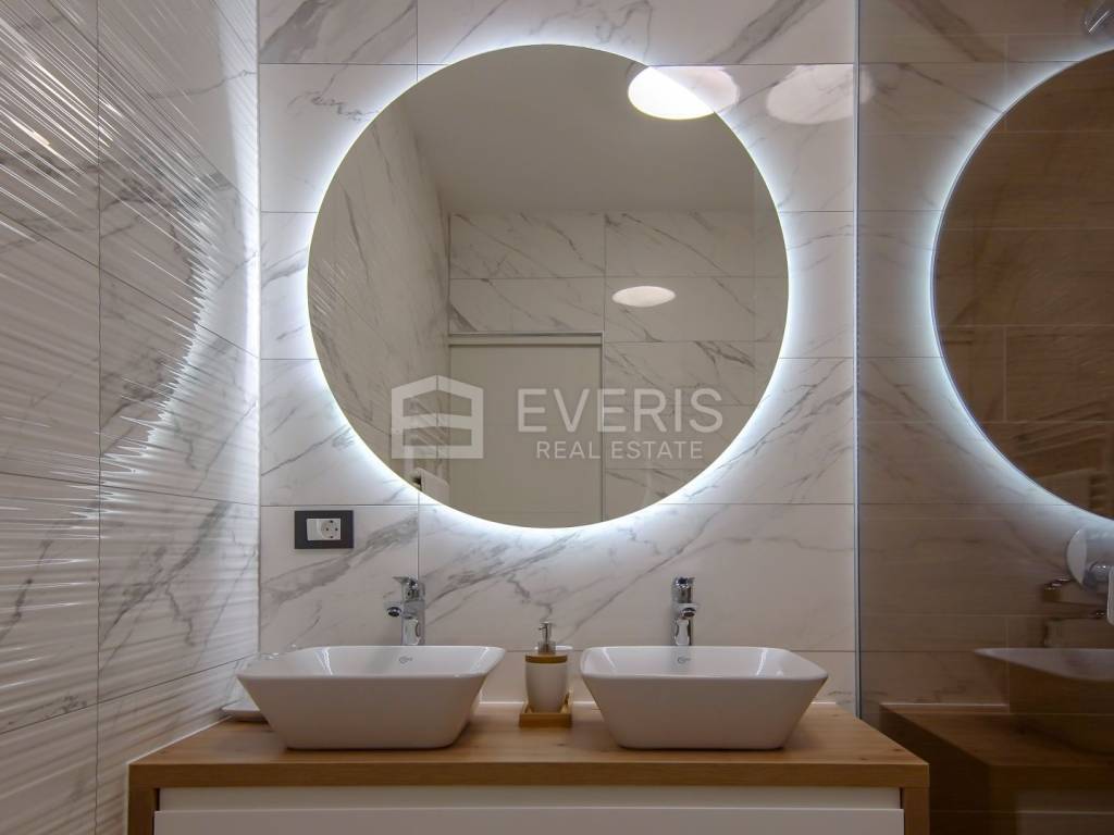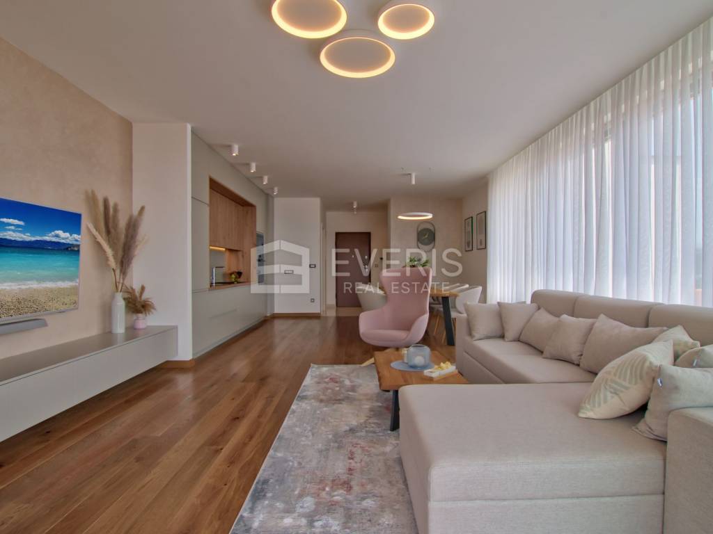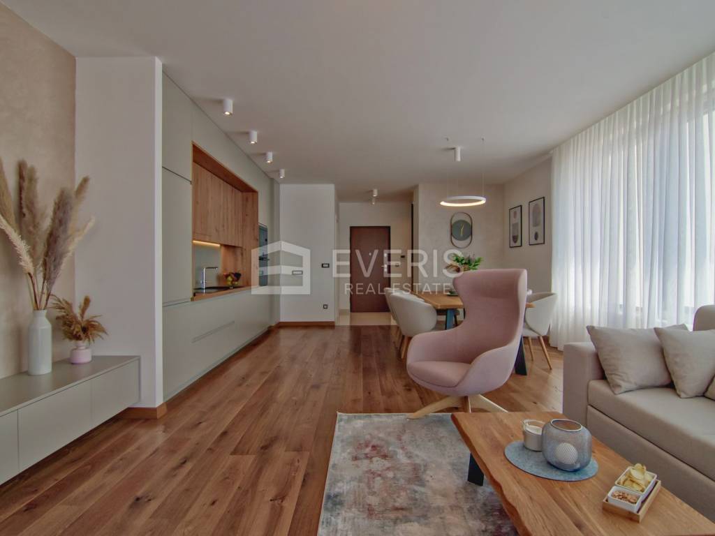 The apartment is two bedrooms + living room, and consists of: entrance hall, kitchen-dining room-living-room-open type, two bedrooms, two bathrooms, laundry room and balcony with sea view.
