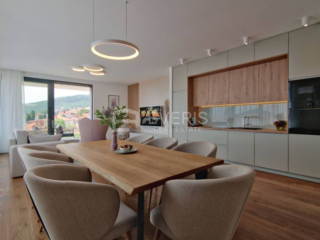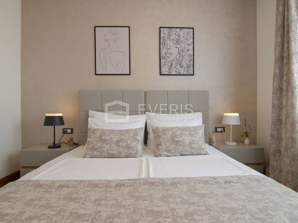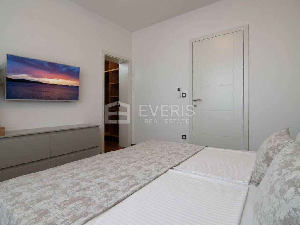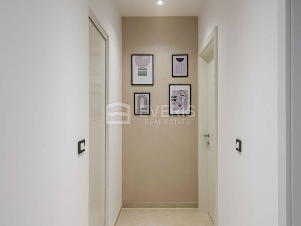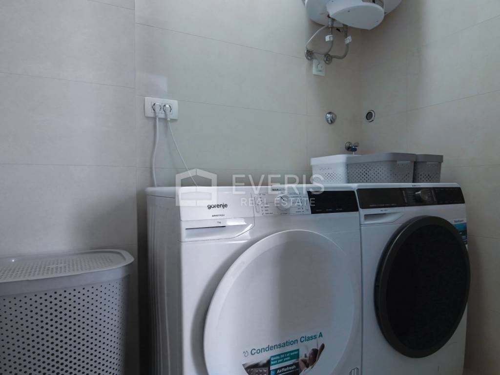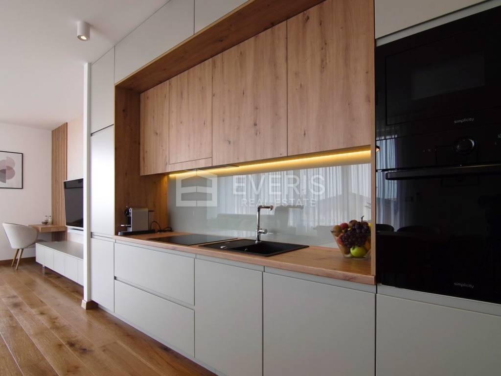 The apartment is two bedrooms + living room, and consists of: entrance hall, kitchen-dining room-living-room-open type, two bedrooms, two bathrooms, laundry room and balcony with sea view.