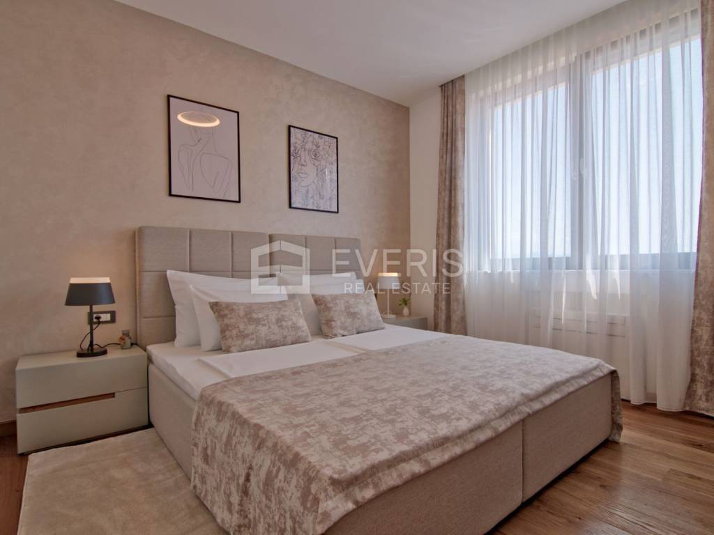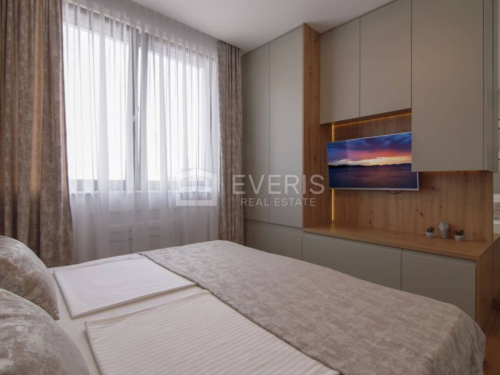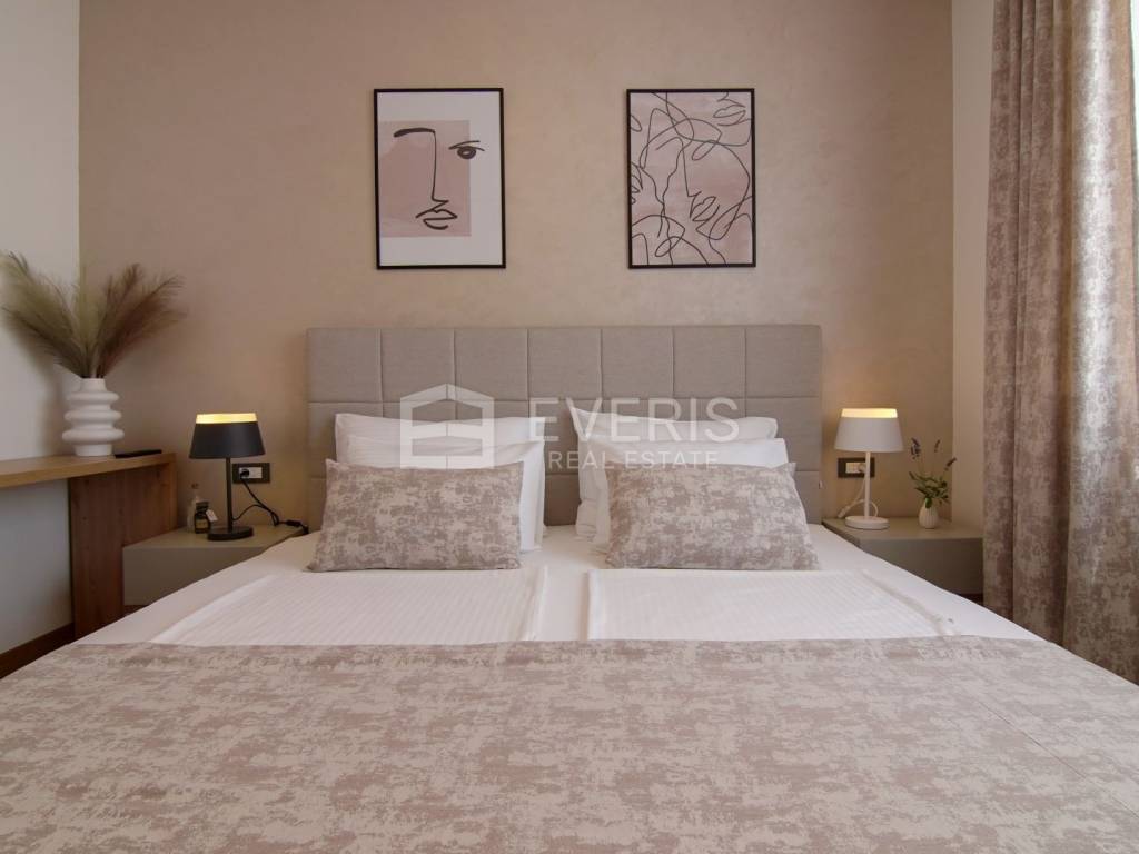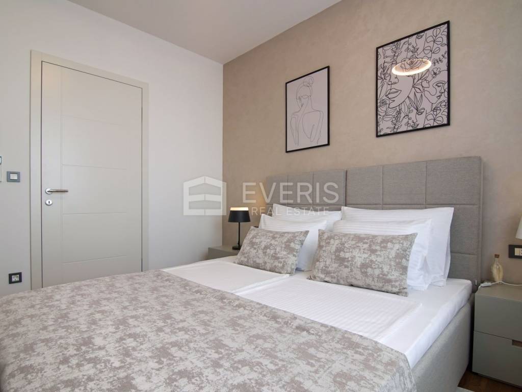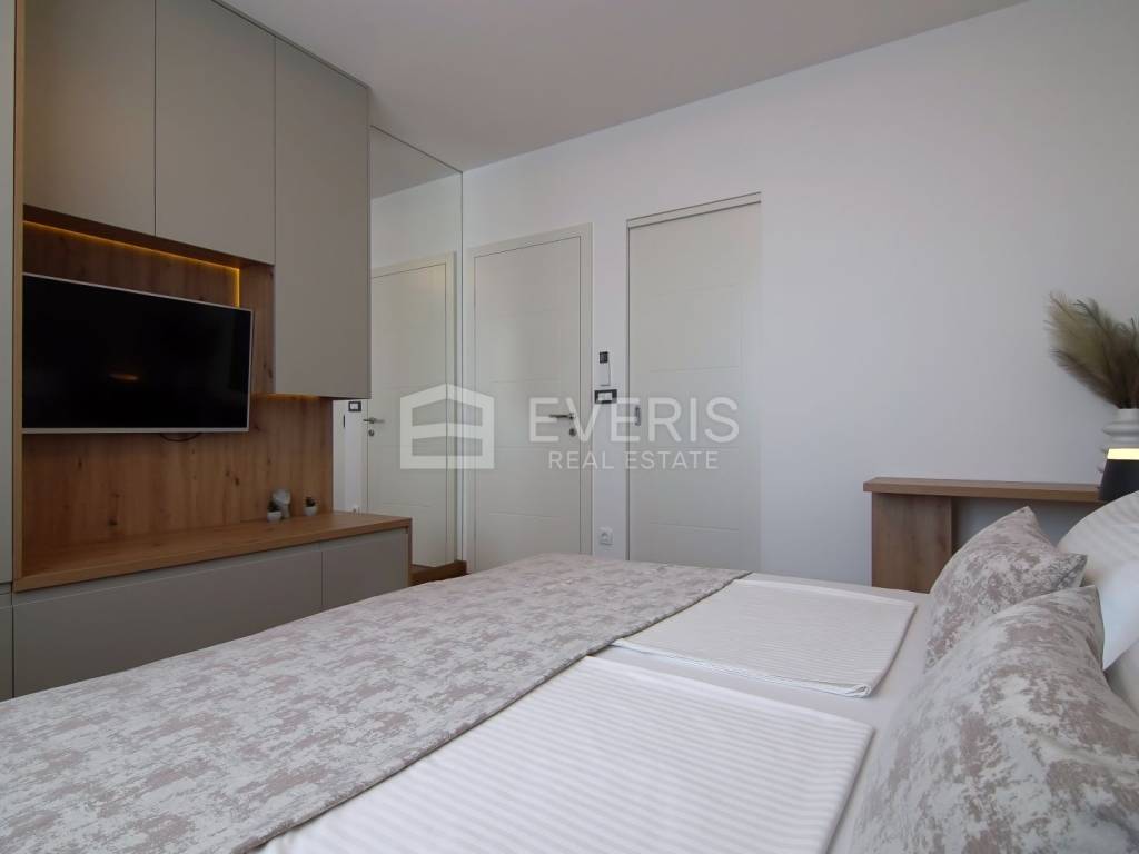 The apartment is two bedrooms + living room, and consists of: entrance hall, kitchen-dining room-living-room-open type, two bedrooms, two bathrooms, laundry room and balcony with sea view.