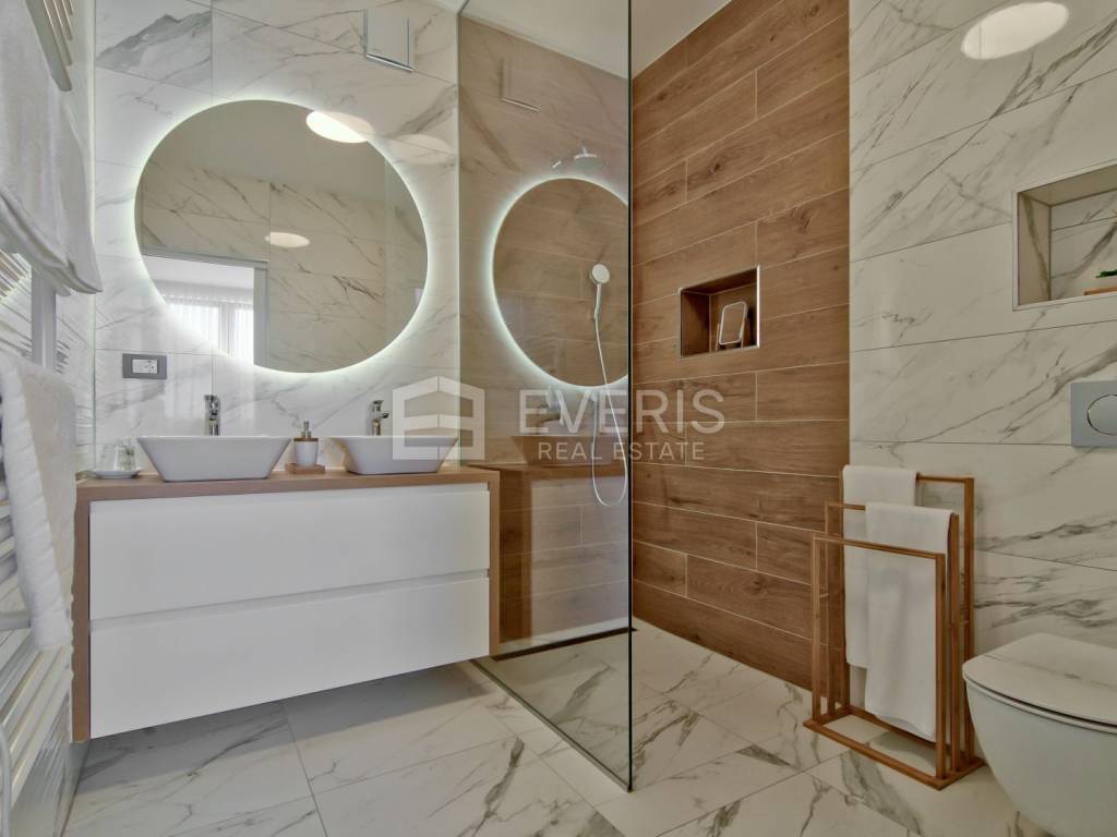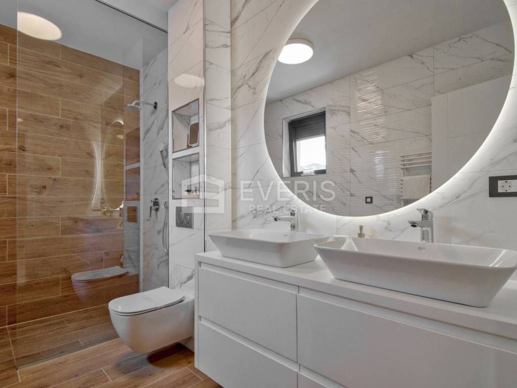 Heating - cooling is through floor air conditioners (Mitsubishi electric), underfloor heating in bathrooms, and exterior carpentry Schucko with electric sunshades, complete interior is designed and equipped with furniture and appliances, exterior insulation of the building stone wool 15 cm - energy certificate of the building is A+.