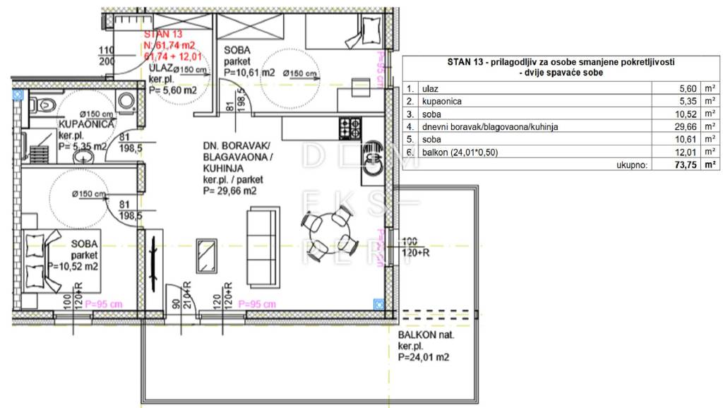 Total apartment area is 73.75 m², including a balcony of 24.01 m² calculated using the appropriate coefficient (12.01 m²)