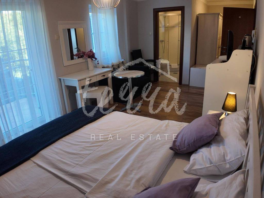 Additionally, the property includes a spacious tavern, which can serve as a common area for guests or be repurposed into an additional facility according to investor preferences. The landscaped courtyard features a swimming pool with a sunbathing area, ensuring a high level of comfort and privacy. Private parking is also provided, which is a significant advantage in the tourism sector.