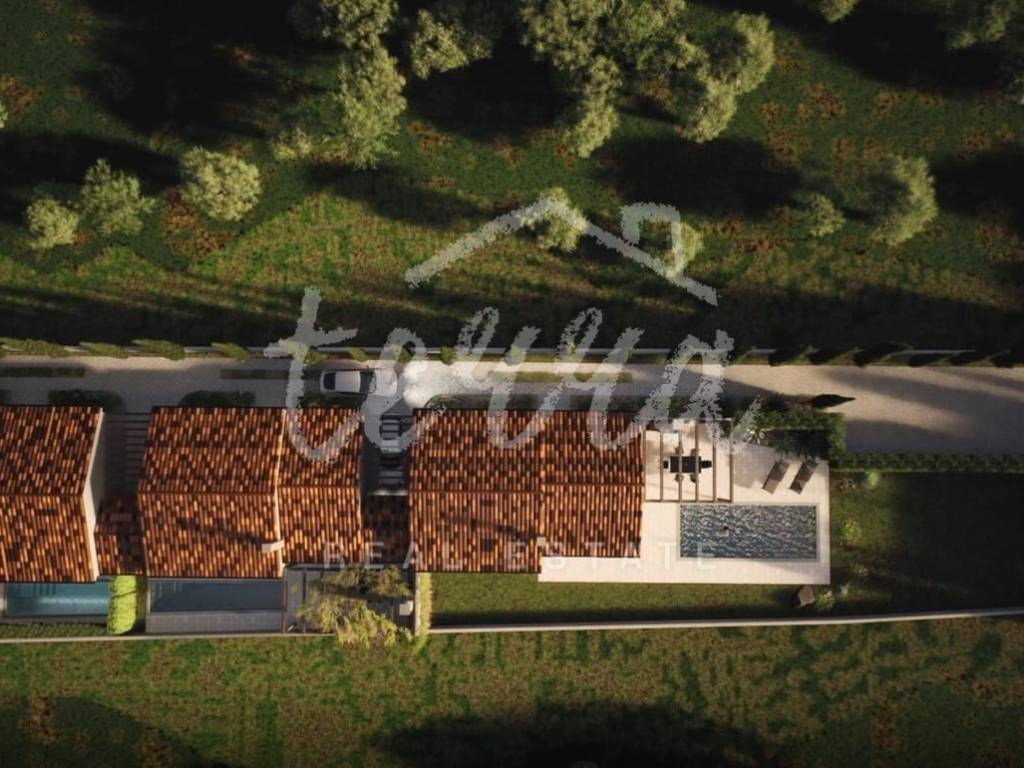 a quiet Istrian village located on a gentle hill, surrounded by olive groves and vineyards,