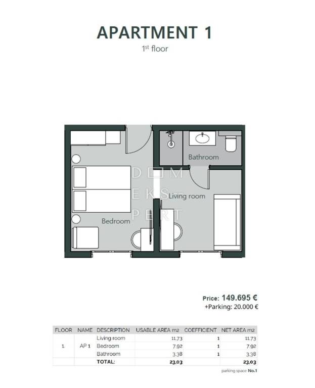 The building consists of a ground floor and two upper floors. The apartment has an area of 23.03 m². It has an excellent and functional layout, is bright, and luxuriously furnished.
