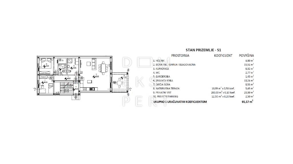 Apartment area 67.62 m² – internal floor area 95.57 m² – total saleable area including appurtenances (parking space, covered terrace and garden) calculated using the applicable coefficients.