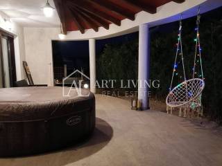 Il piano terra è composto da soggiorno con zona pranzo e cucina a vista, 3 camere da letto cabina bagno e bagno separato. Dal soggiorno e dalla cucina si accede direttamente ad una spaziosa terrazza coperta di 30 m2 con jacuzzi e zona soggiorno.