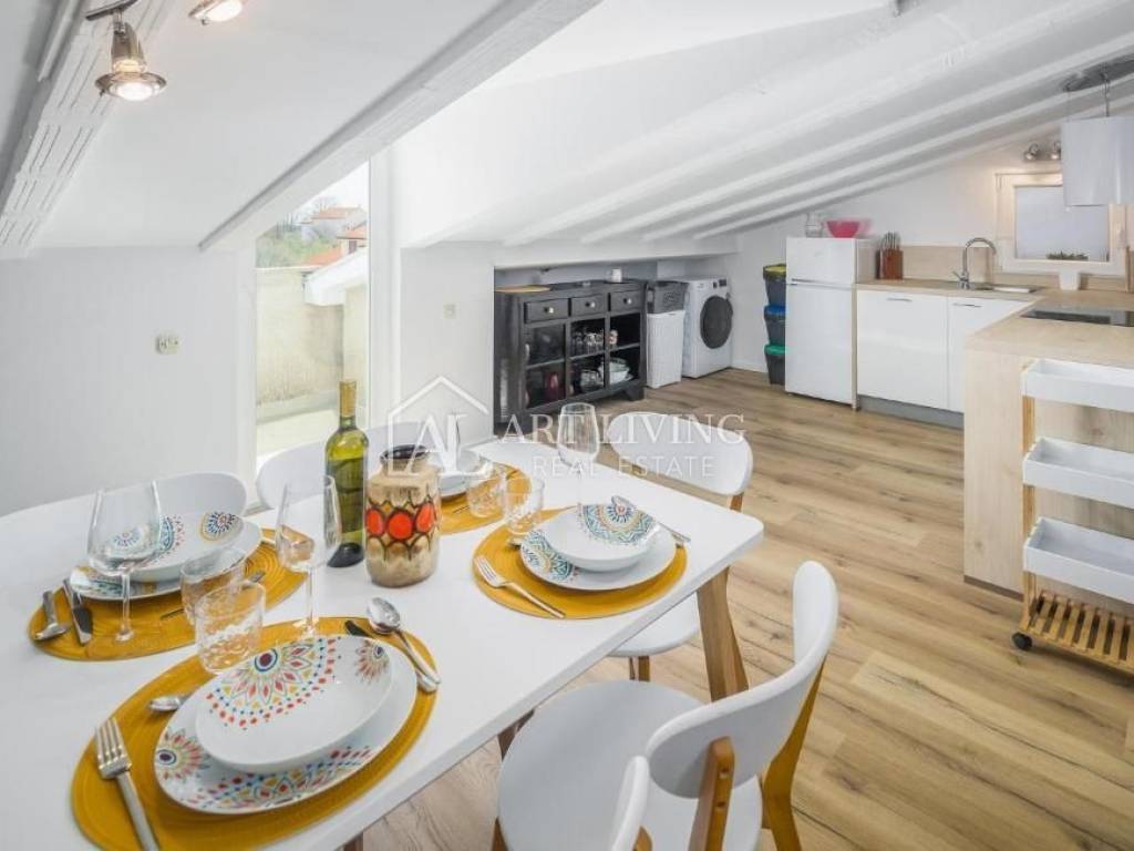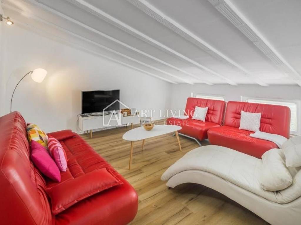Nella mansarda si trova un soggiorno con zona pranzo e cucina, due camere da letto e un bagno.