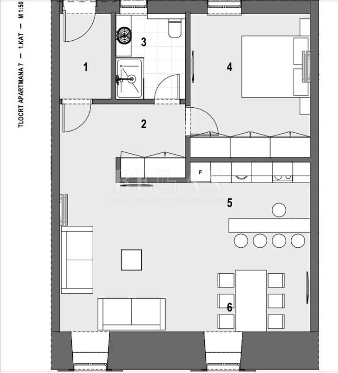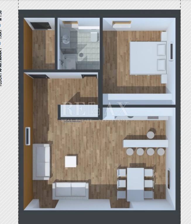 Si compone di una camera da letto, bagno, cucina con sala da pranzo e soggiorno.