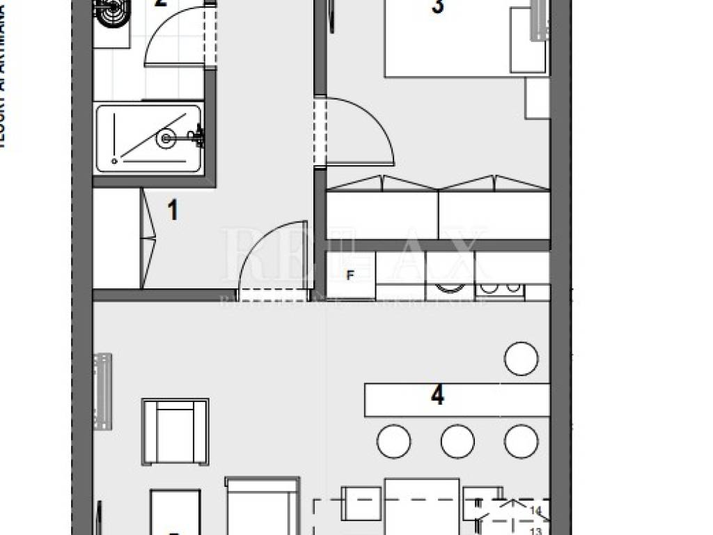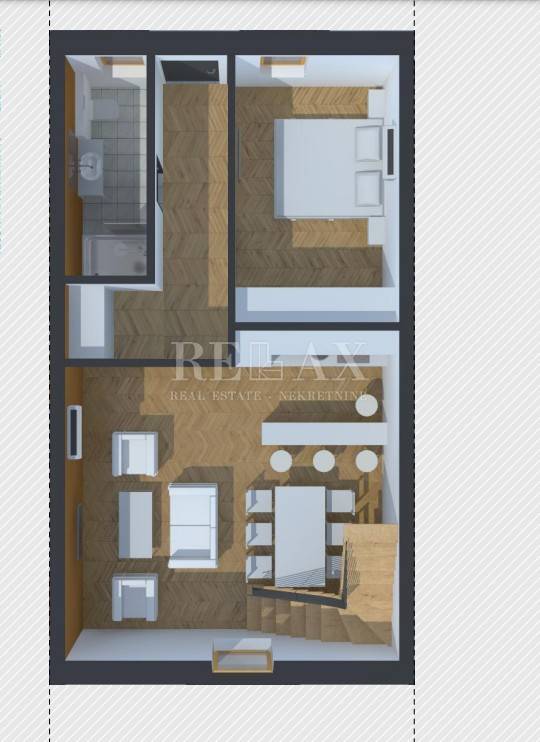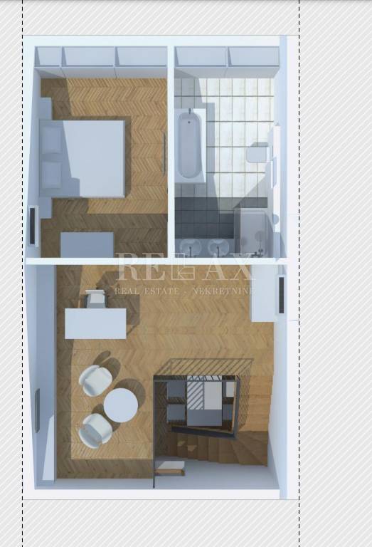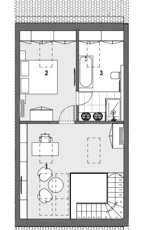 L'appartamento è composto da un ingresso, una camera da letto, un bagno, una cucina open space con sala da pranzo e soggiorno da dove saliamo le scale fino all'alta mansarda dove arriviamo alla sala da dove andiamo alla camera con il bagno.