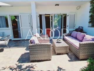 Il secondo appartamento più grande, anch'esso destinato alla locazione turistica, è composto da un ampio soggiorno, sala da pranzo, cucina, camera da letto e bagno. Da questo appartamento si accede ad una terrazza esterna collegata ad un giardino recintato di 470 mq, ideale per i giochi dei bambini.
