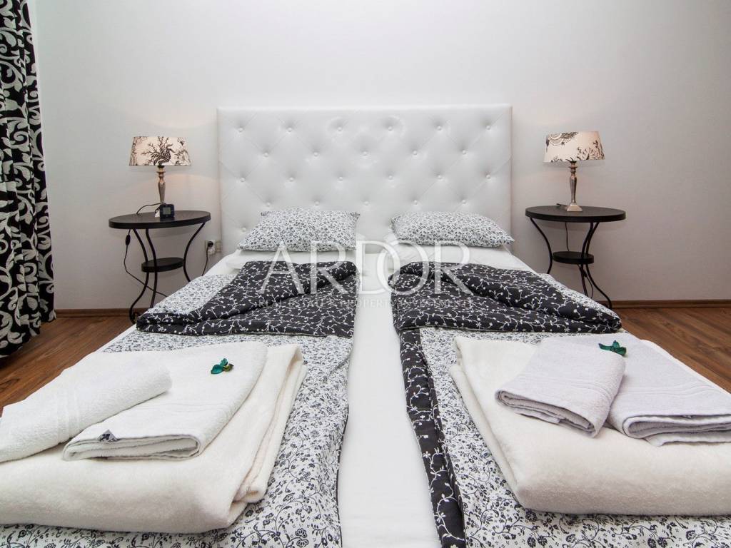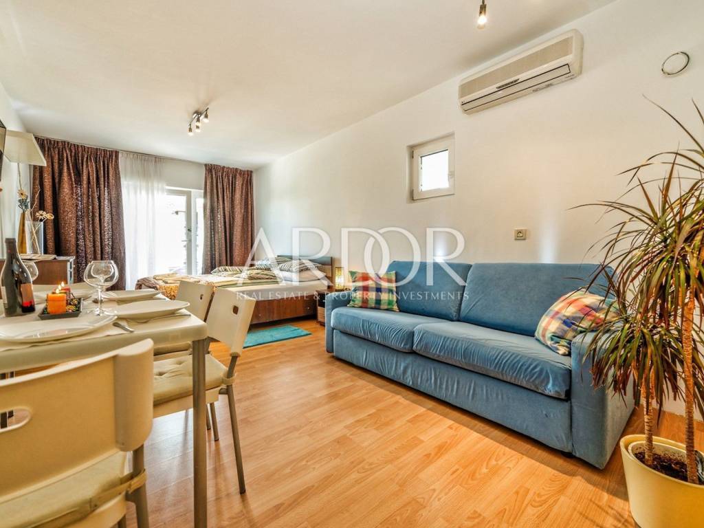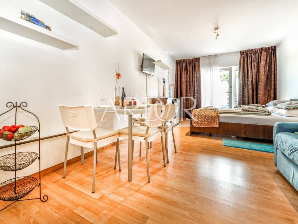 Gli appartamenti condividono un ingresso comune e da un lato si accede ad un appartamento più piccolo che attualmente funge da monolocale e viene affittato con successo ai turisti. Si compone di un unico ambiente con camera da letto, soggiorno e sala da pranzo con cucina e bagno.