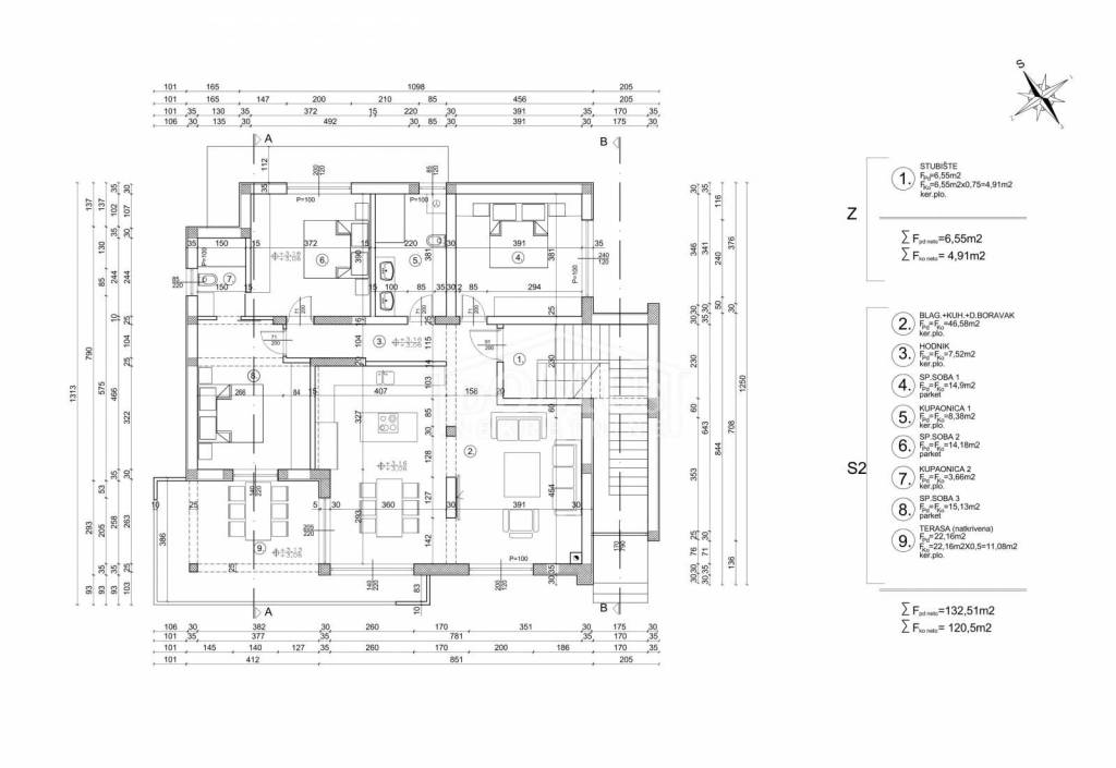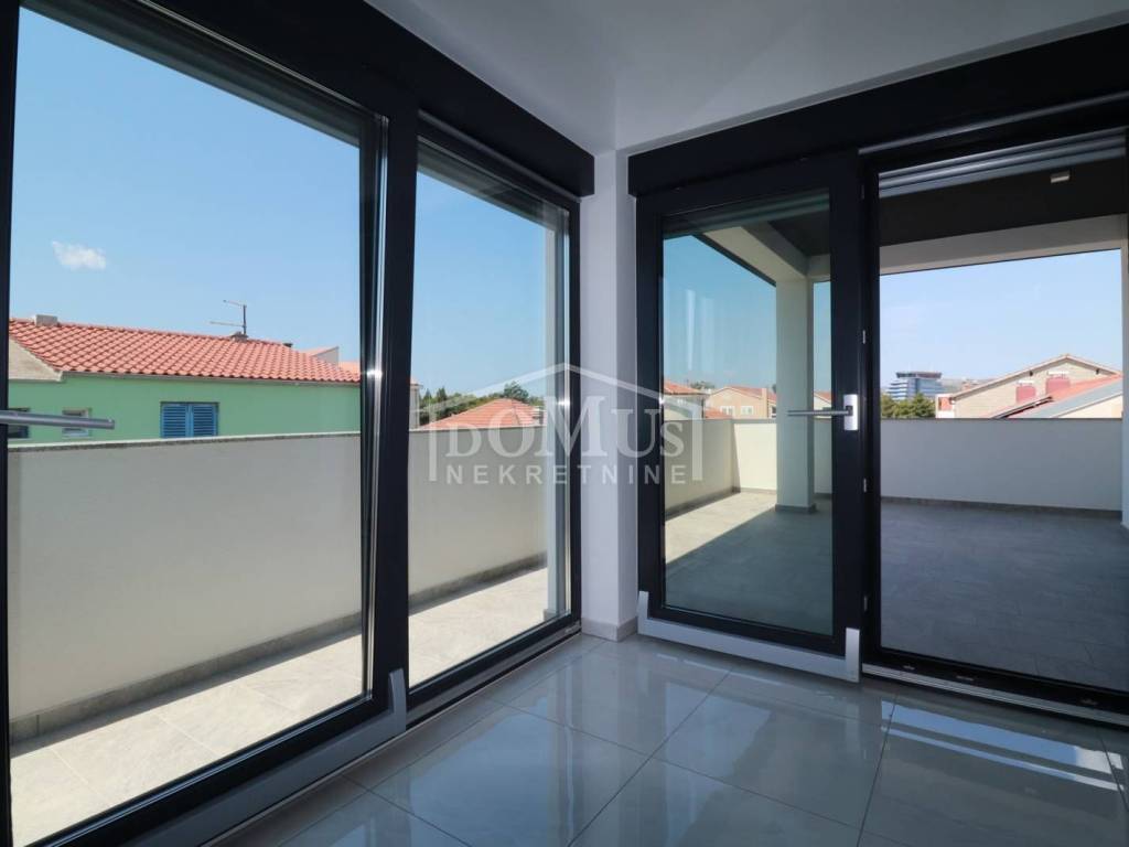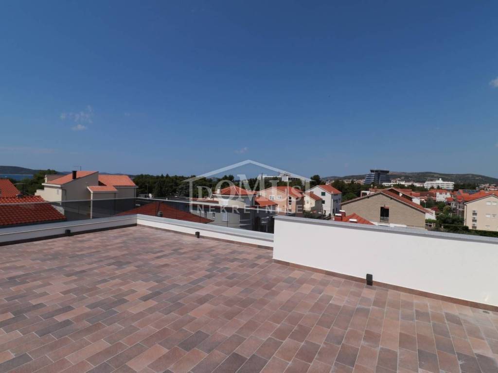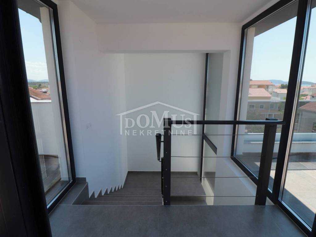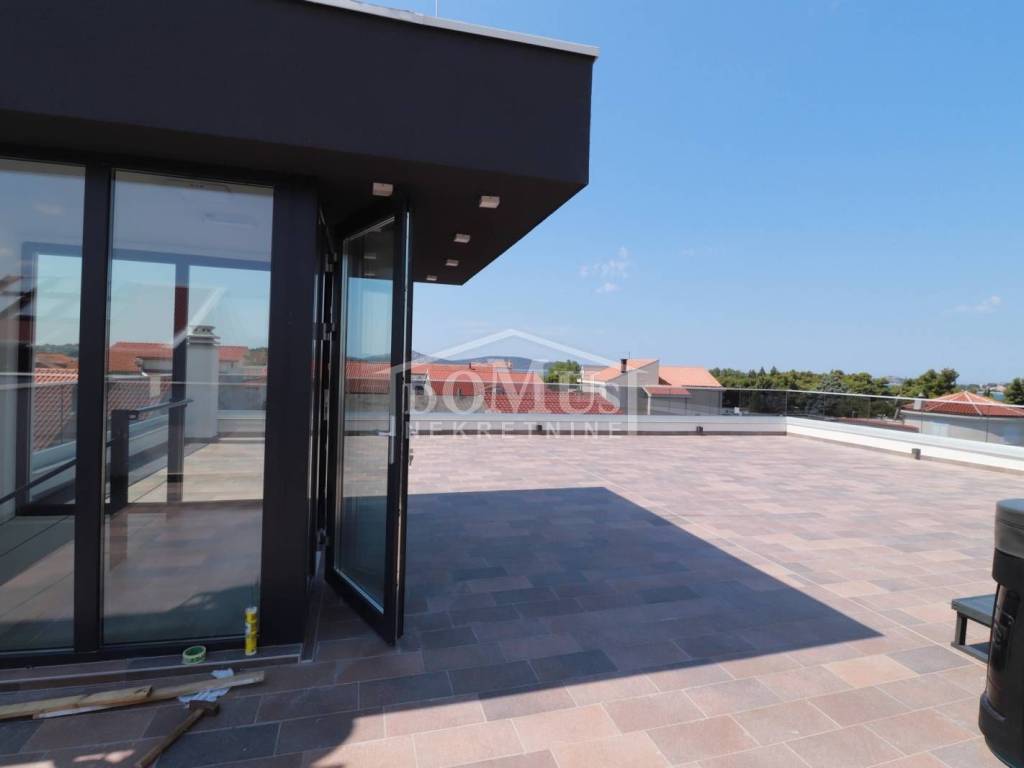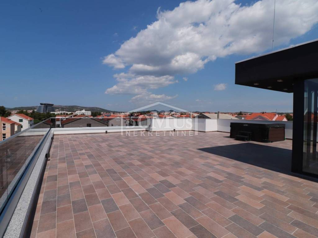 The apartment on the 2nd floor has 168.79 m2 of usable area, consists of an entrance hall / hallway, spacious kitchen with dining area and living room with access to a large covered terrace with an area of 21.64 m2, three bedrooms, two bathrooms, the whole roof terrace which has an area of 126m2 on which the jacuzzi is placed, the terrace offers a beautiful view of the sea and the city of Vodice, the apartment has two parking spaces.