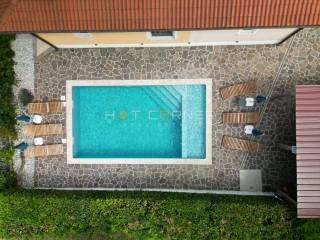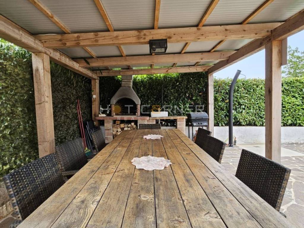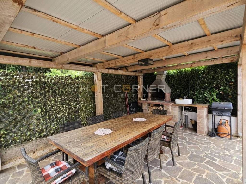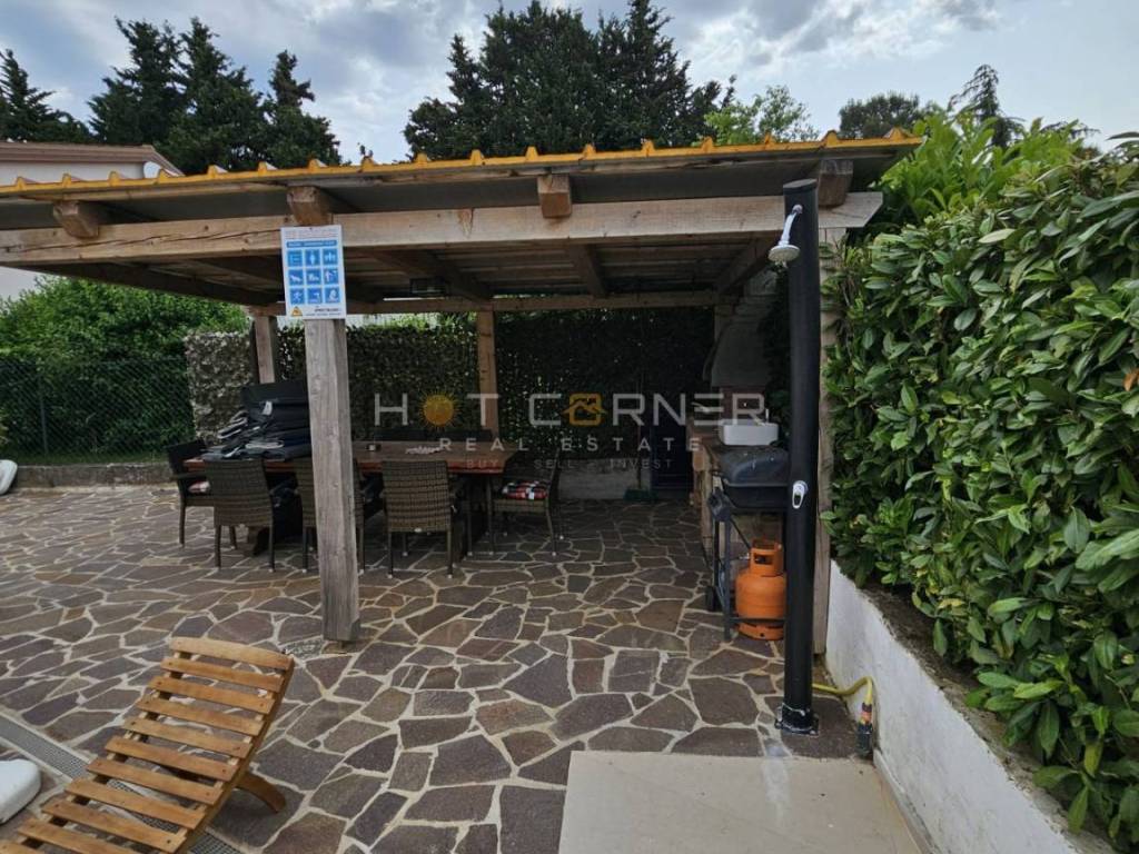 Dietro la casa si trova una piscina moderna e completamente automatizzata con un sistema di idrolisi, che la rende completamente naturale e salina, eliminando la necessità di utilizzare il cloro. È circondata da un'area solarium di 100 m², ideale per rilassarsi e godersi le giornate di sole. Accanto alla piscina c'è anche uno spazio coperto con barbecue e un grande tavolo da pranzo, perfetto per incontri familiari o con amici.