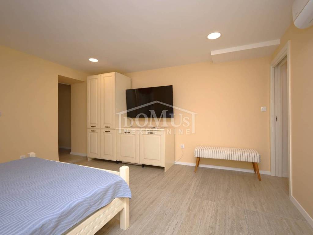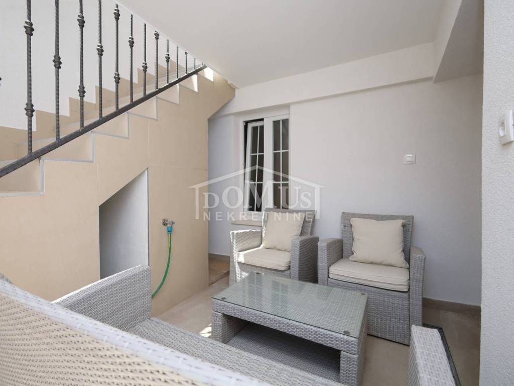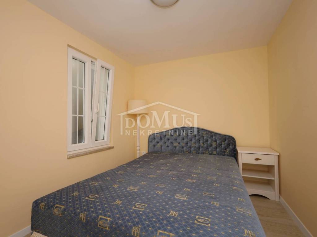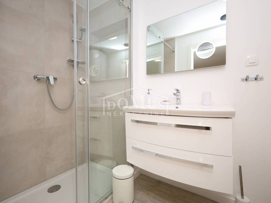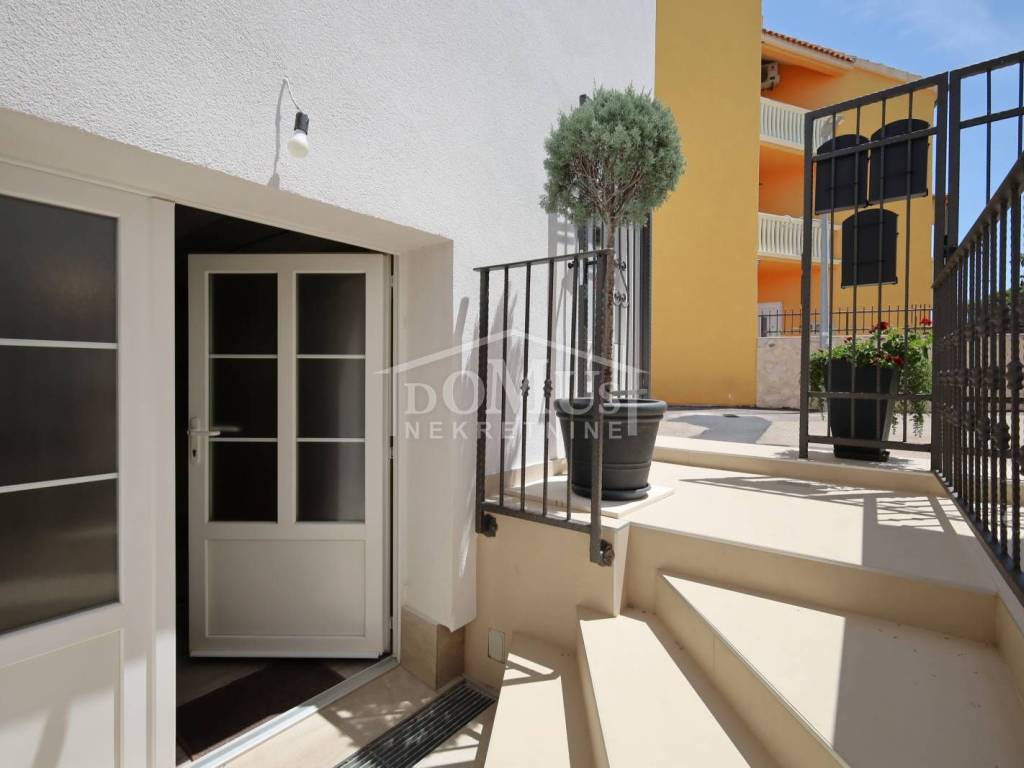 Vodice, in an attractive location, in the immediate vicinity of the center and only 200m from the Blue beach, a comfortable 2-room apartment with a total of 67.82m2 of usable area. The apartment is located in the basement of a smaller residential building. It consists of an entrance area / terrace of 14.19m2, a storage room, a kitchen with a dining room and a living room, a guest toilet, a bathroom, a storage room, and two bedrooms. The apartment is air-conditioned, fully furnished. It has 1 parking space. The apartment is located only 200m from the Blue beach, and 450m from the center and all essential facilities for life