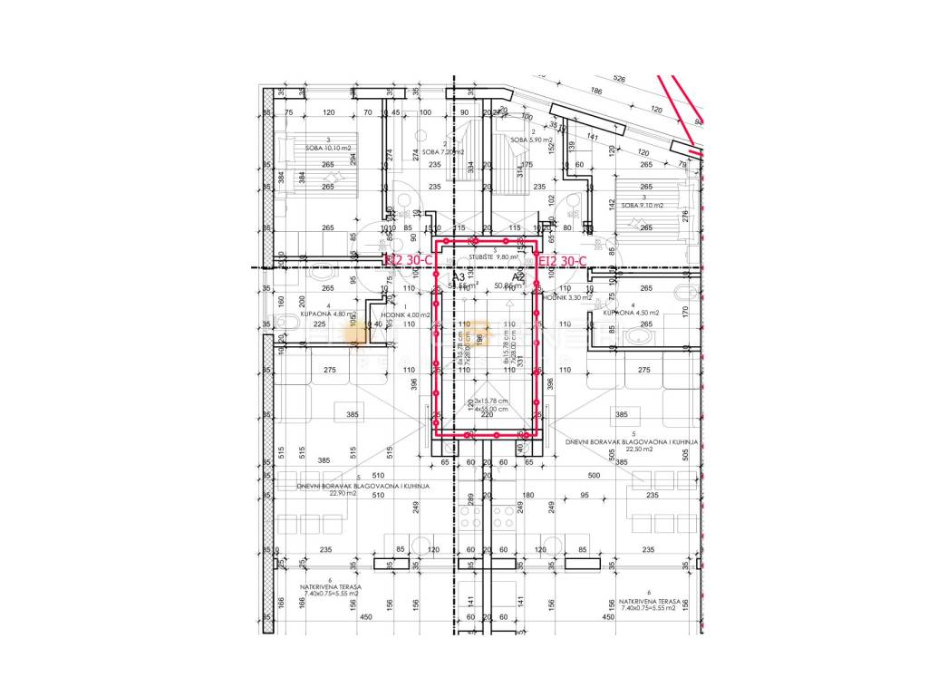 In vendita un bellissimo appartamento in un moderno edificio di nuova costruzione vicino a Pola. L'appartamento A3 si trova al 1° piano di un piccolo condominio residenziale in posizione tranquilla, ha una superficie abitabile di circa 55 m² ed è composto da 2 camere da letto (10,10 m², 7,20 m²), un disimpegno (4,00 m²), un soggiorno, una sala da pranzo e una cucina (22,90 m²) con accesso a una terrazza coperta di 7,40 m² e un bagno di 4,80 m².
