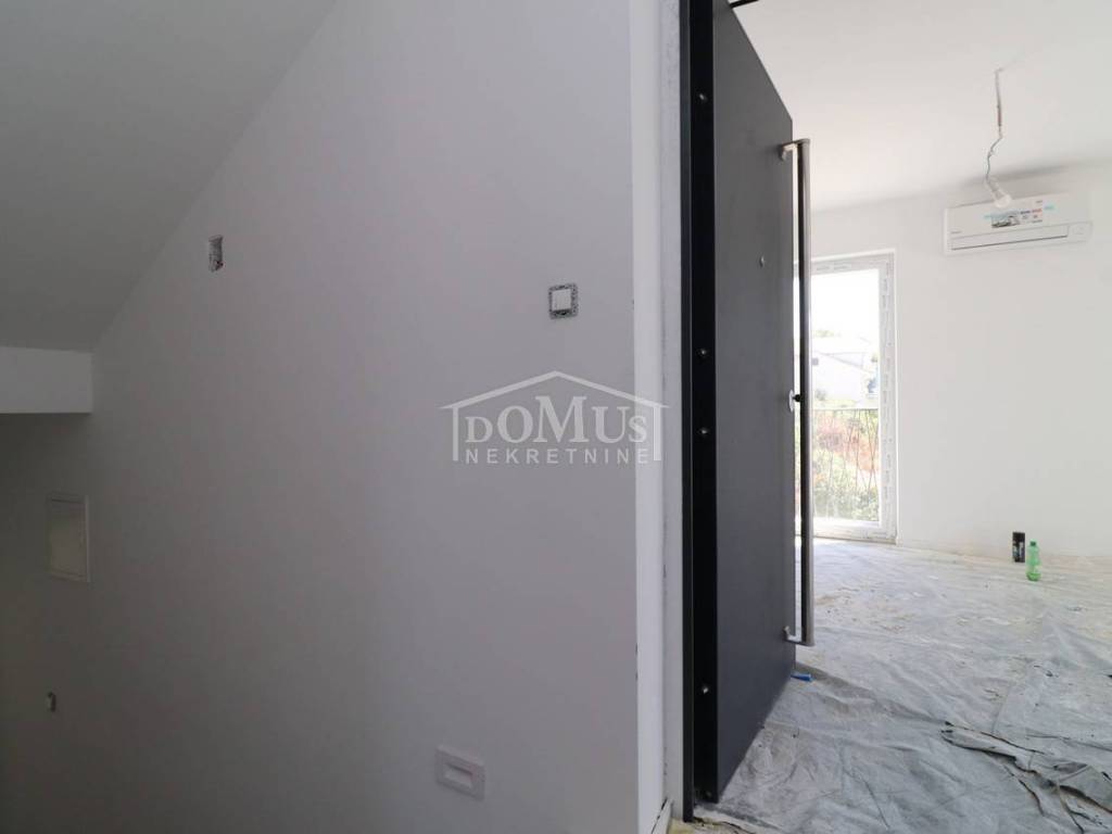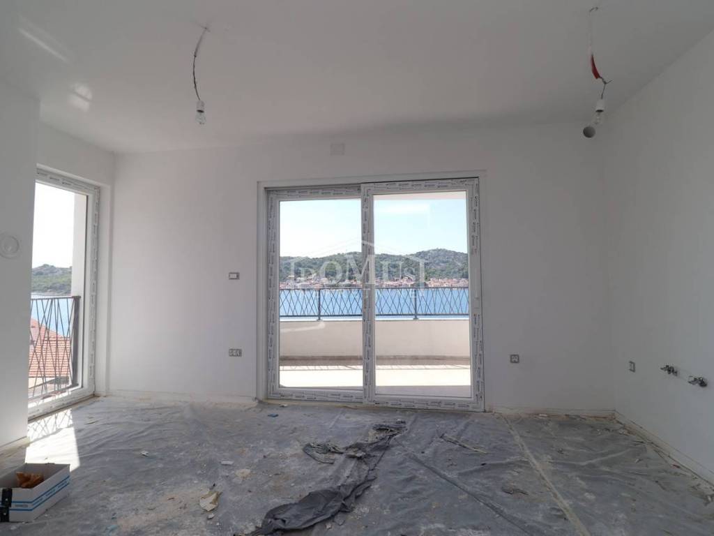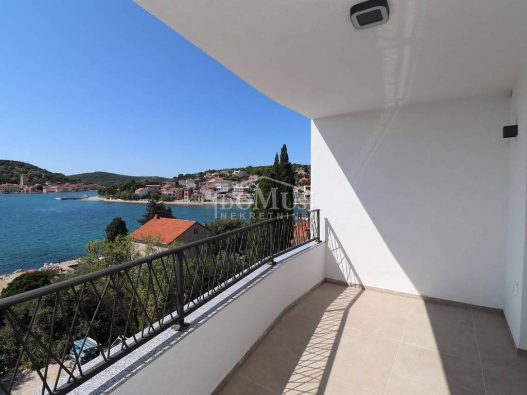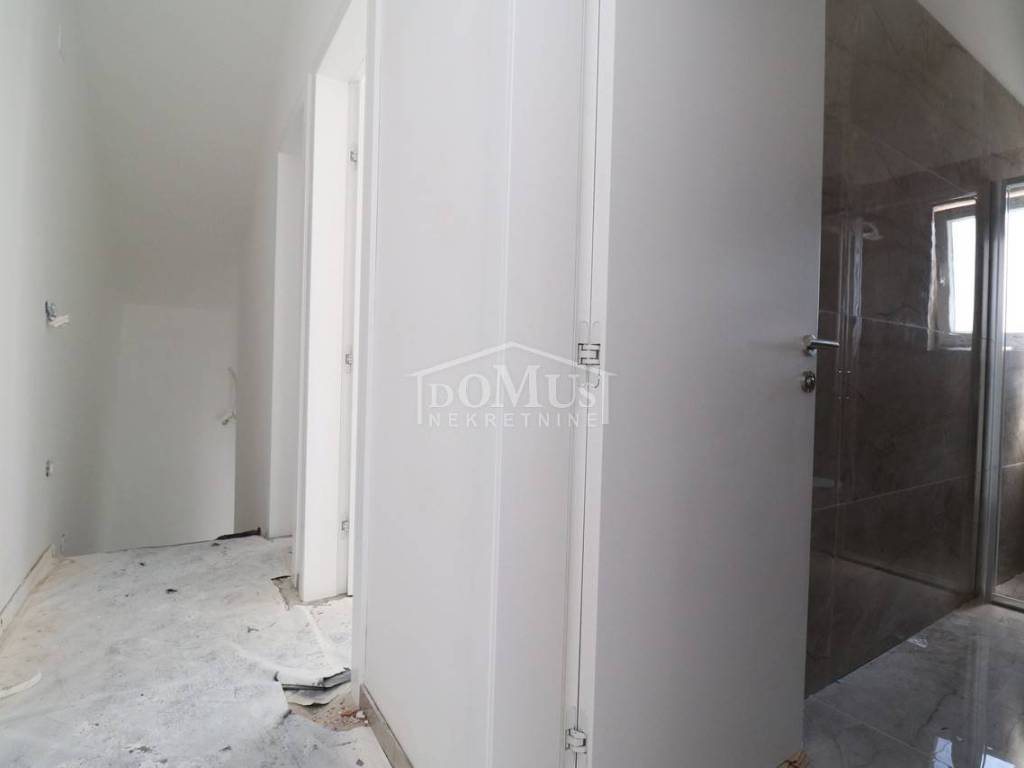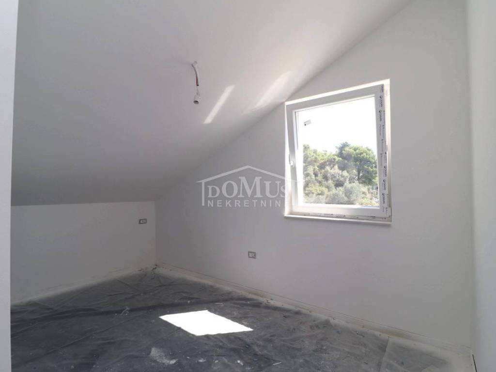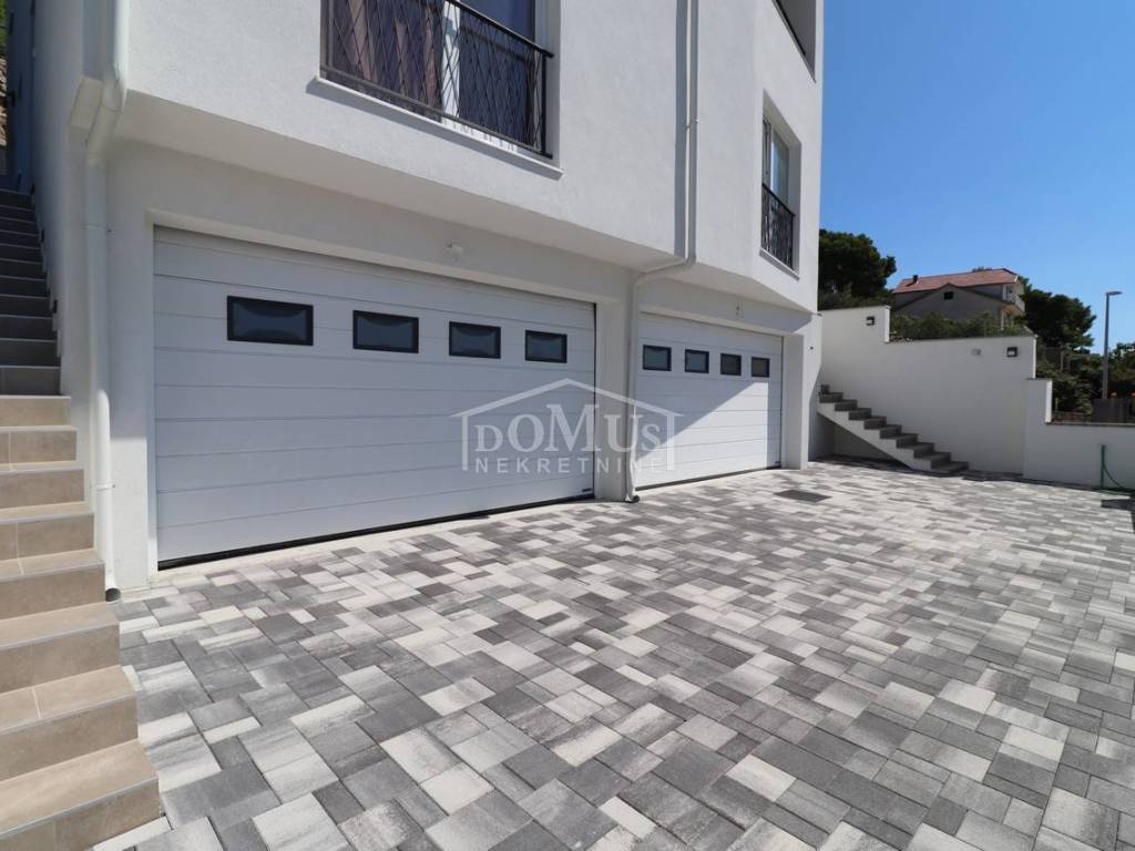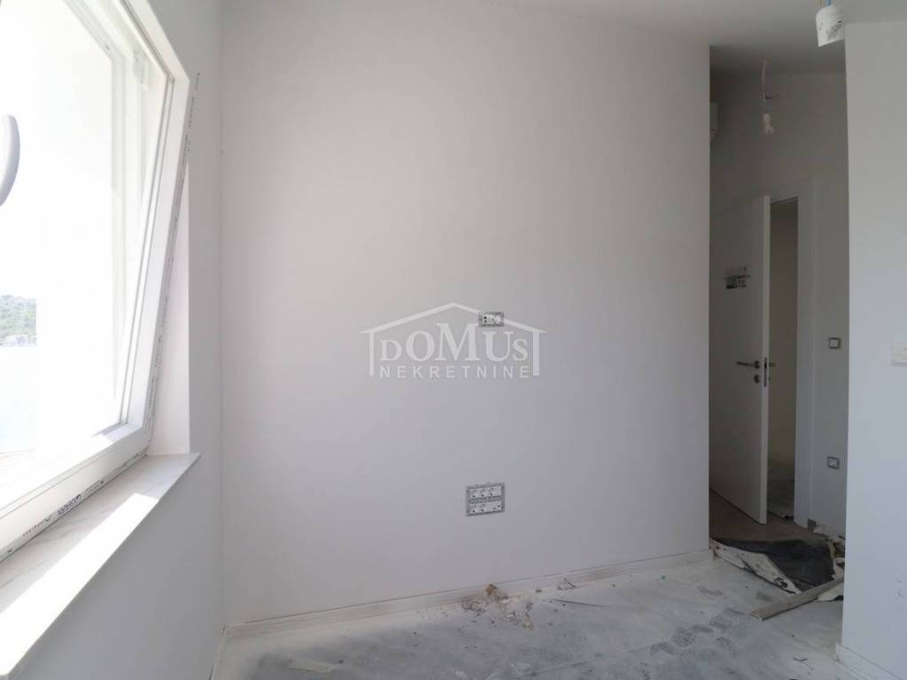 New construction, attractive location, 2nd row to the sea, two-story apartment with a panoramic view of the sea with a total of 86.02 m2 of usable area. The apartment has a modern design and functional layout and is located on the 2nd floor and attic of a residential building, oriented to the southwest. It consists on the 2nd floor of an entrance hall, a bathroom, a living room with a kitchen and a dining room, a loggia of 9.96 m2, a staircase, and in the attic three bedrooms and a bathroom. The apartment is built of high-quality materials, equipped with Panasonic air conditioners (multi-split system) in every room, electric underfloor heating throughout the apartment, heat pump for hot water, PVC carpentry with aluminum shutters with mosquito nets, anti-burglary/fire doors. The apartment has one garage parking space of 14.5 m2 (Hormann electric lift garage door) and a storage room. The apartment is 70 m from the beach and 1200 m from the town center.