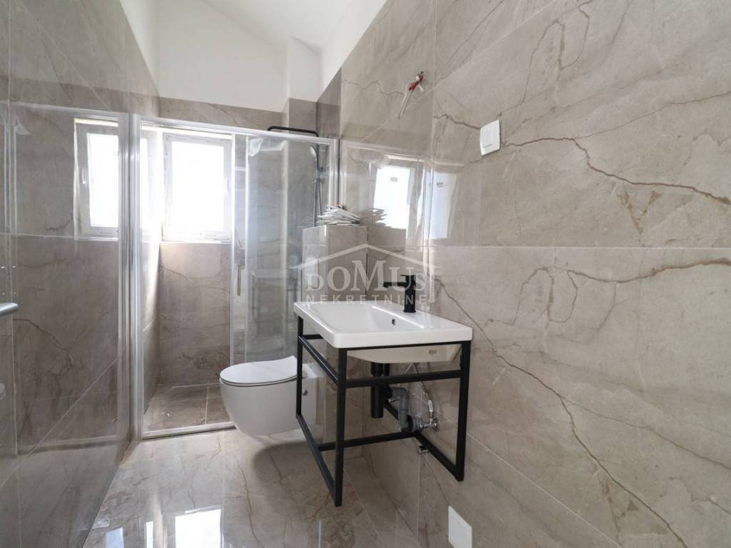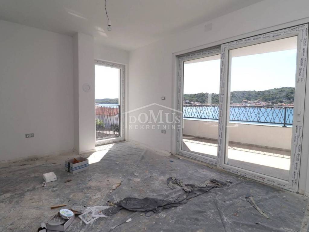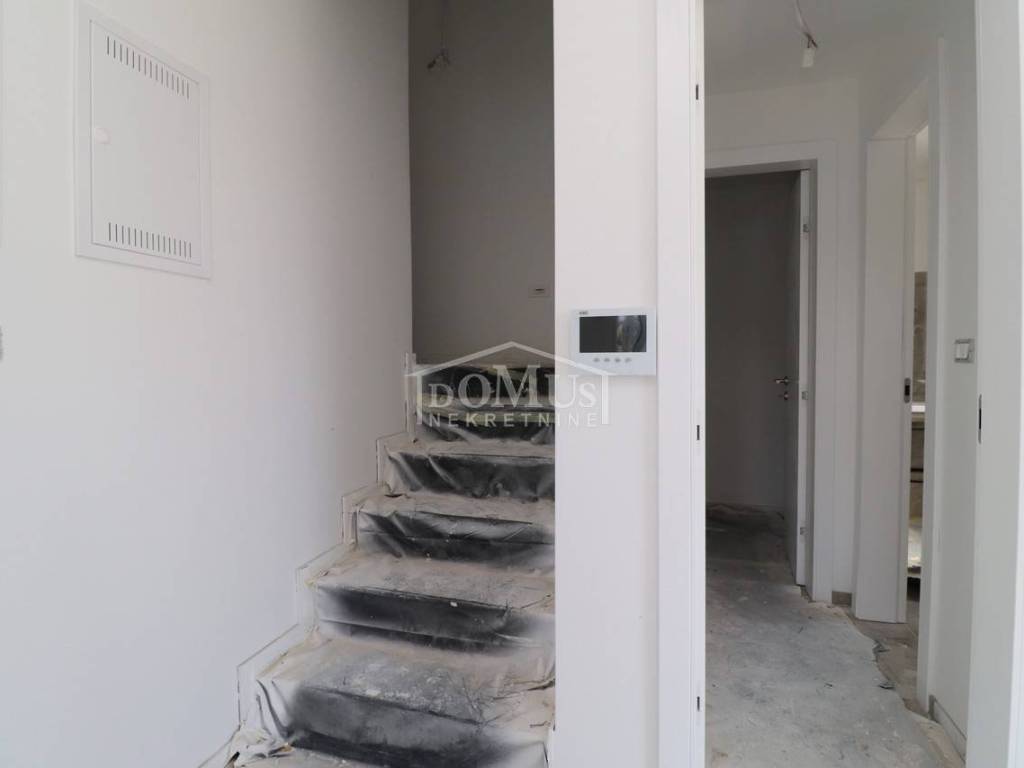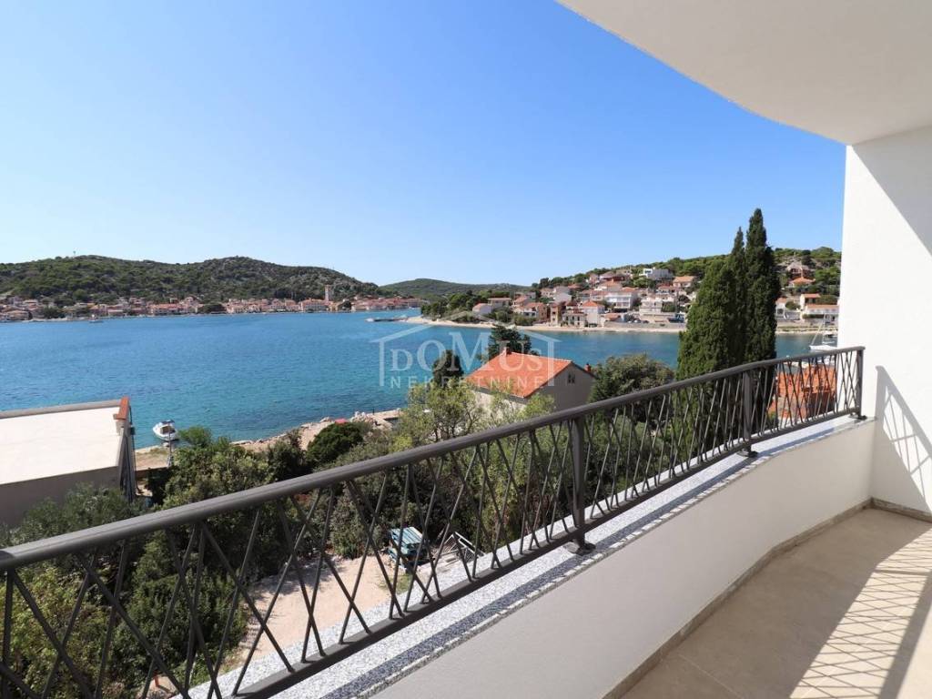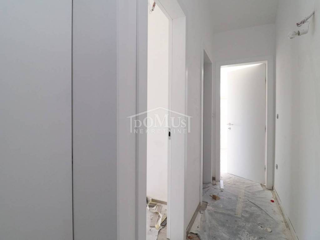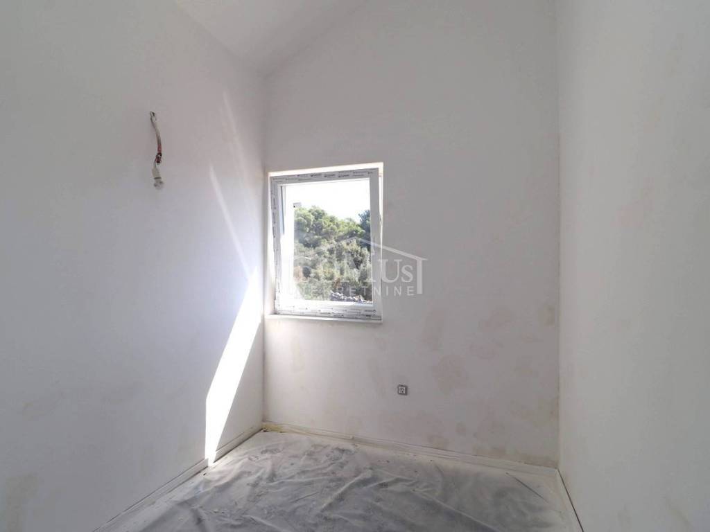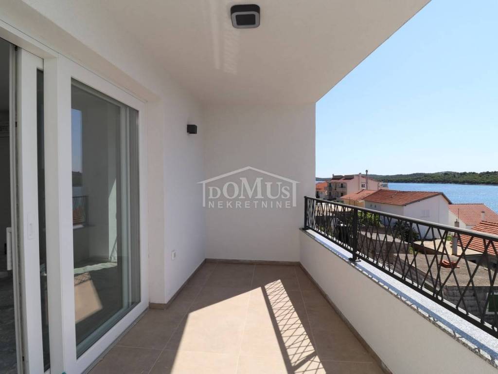New construction, attractive location, 2nd row to the sea, two-story apartment with a panoramic view of the sea with a total of 86.02 m2 of usable area. The apartment has a modern design and functional layout and is located on the 2nd floor and attic of a residential building, oriented to the southwest. It consists on the 2nd floor of an entrance hall, a bathroom, a living room with a kitchen and a dining room, a loggia of 9.96 m2, a staircase, and in the attic three bedrooms and a bathroom. The apartment is built of high-quality materials, equipped with Panasonic air conditioners (multi-split system) in every room, electric underfloor heating throughout the apartment, heat pump for hot water, PVC carpentry with aluminum shutters with mosquito nets, anti-burglary/fire doors. The apartment has one garage parking space of 14.5 m2 (Hormann electric lift garage door) and a storage room. The apartment is 70 m from the beach and 1200 m from the town center.