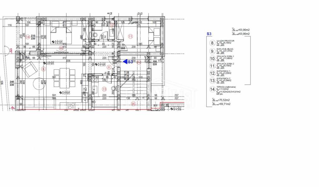 Apartment S3 features a modern design and functional layout, with a total usable area of 69.71 m².
