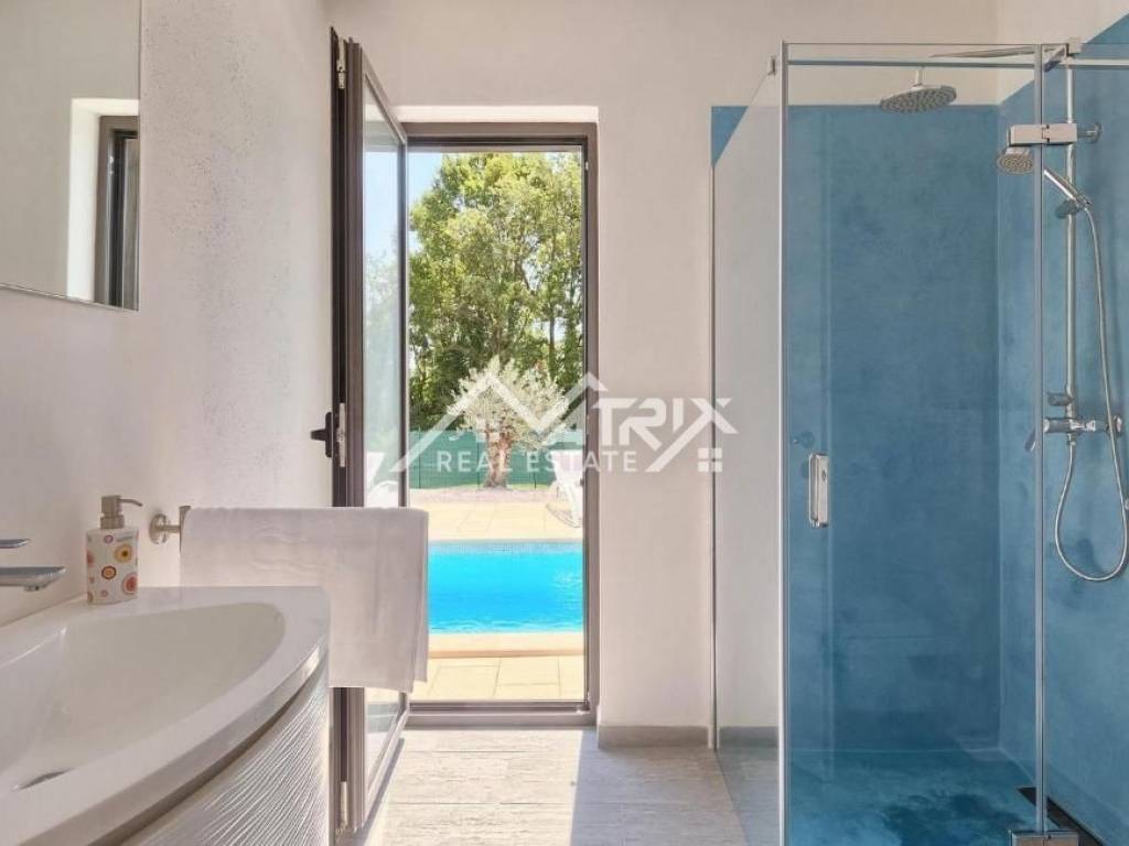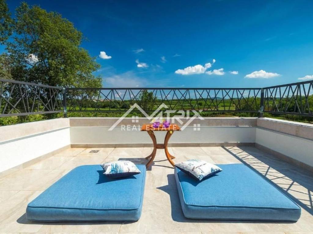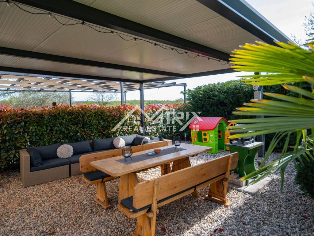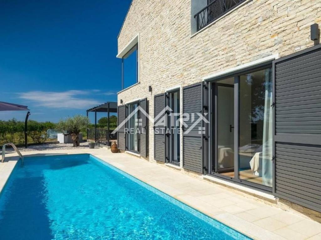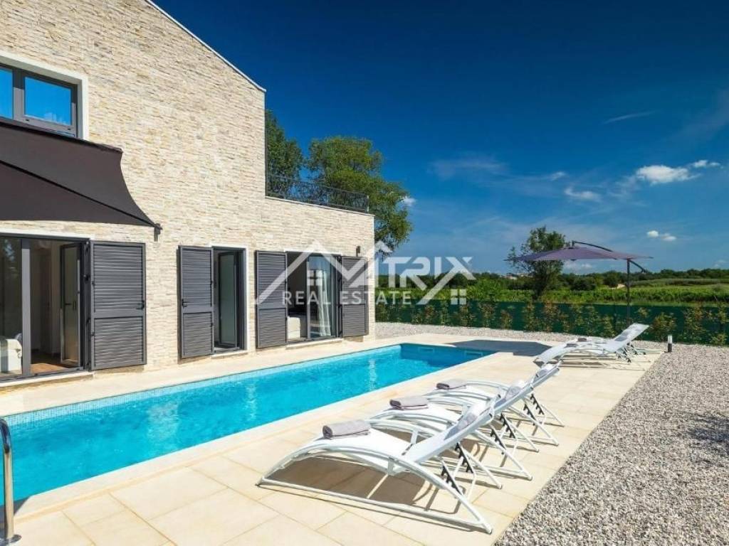 A beautiful, modern villa with a swimming pool for sale, located in a peaceful area of the Istrian countryside, just 5 km from the town of Novigrad and its beaches, 13 km from Umag, and 27 km from the Slovenian border.