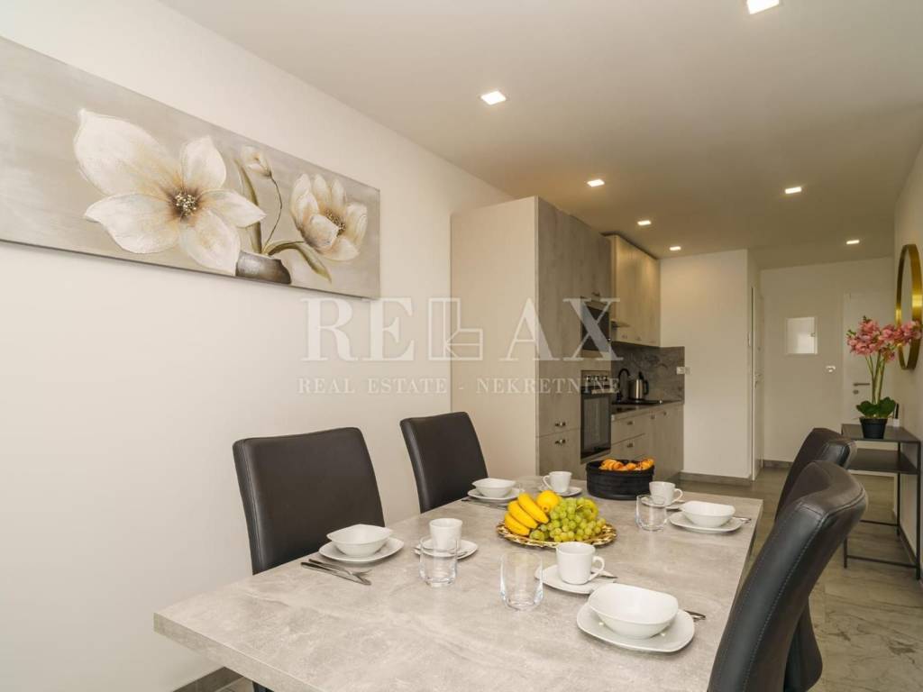 L’interno dell’appartamento è arredato con cura e comprende un soggiorno collegato alla zona pranzo e alla cucina in un concetto open space, due camere da letto, un bagno e un corridoio. L’appartamento viene venduto completamente arredato, con dettagli scelti con attenzione e materiali di qualità, permettendo un immediato trasferimento senza necessità di ulteriori investimenti.